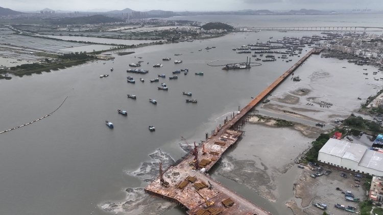 茂名博贺渔港经济区一期工程码头主栈桥钢平台合龙