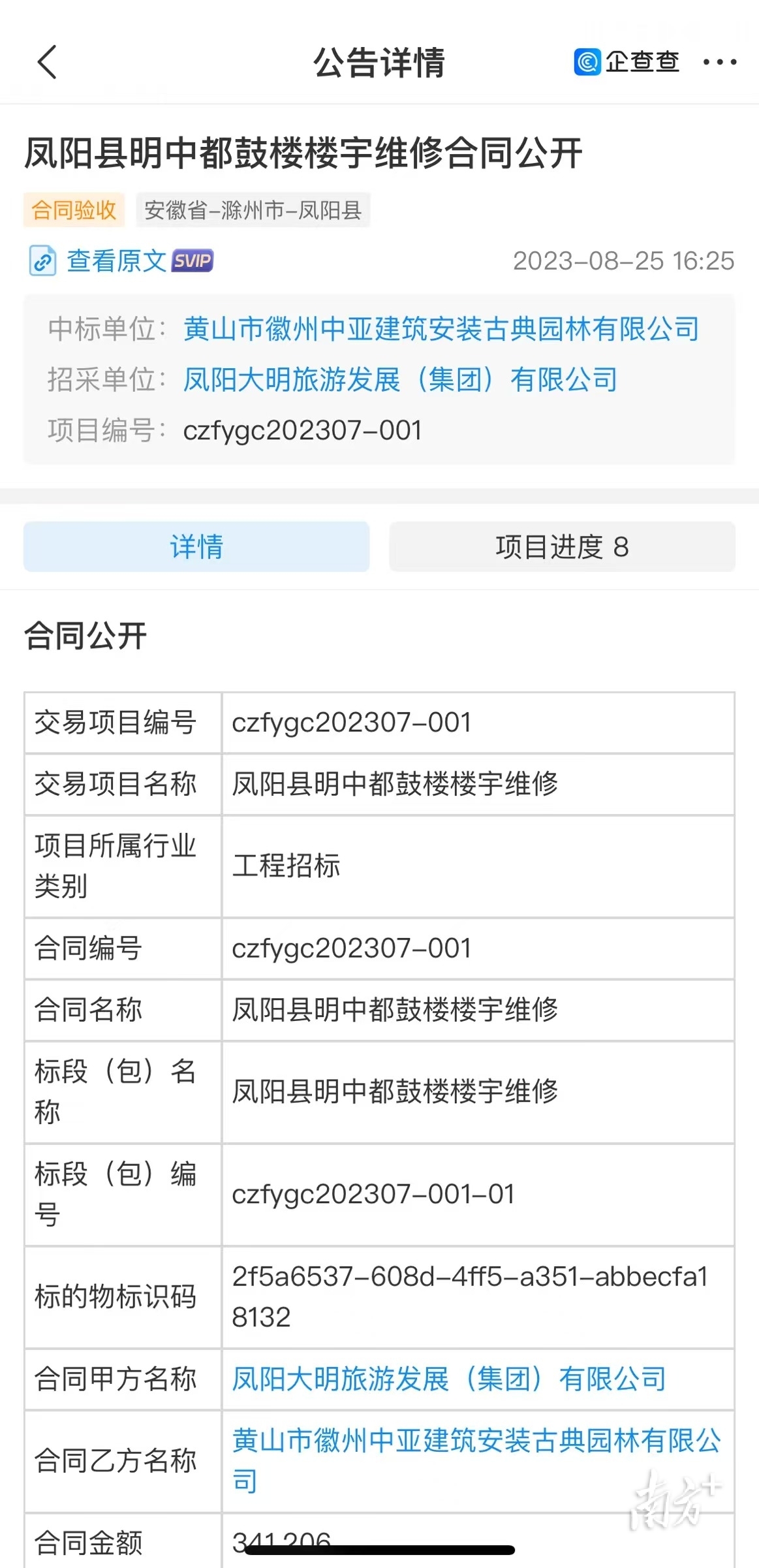 记者查询“企查查”发现,凤阳大明旅游发展(集团)有限公司于2023年4月25日发布该楼楼宇的维修招标公告,由黄山市徽州中亚建筑安装古典园林有限公司中标。合同签署日期为2023年8月25日,完成日期是2024年2月21日。但根据黄山市建筑协会官网发布的信息显示,该项目最终“于2024年6月5日通过竣工验收”。