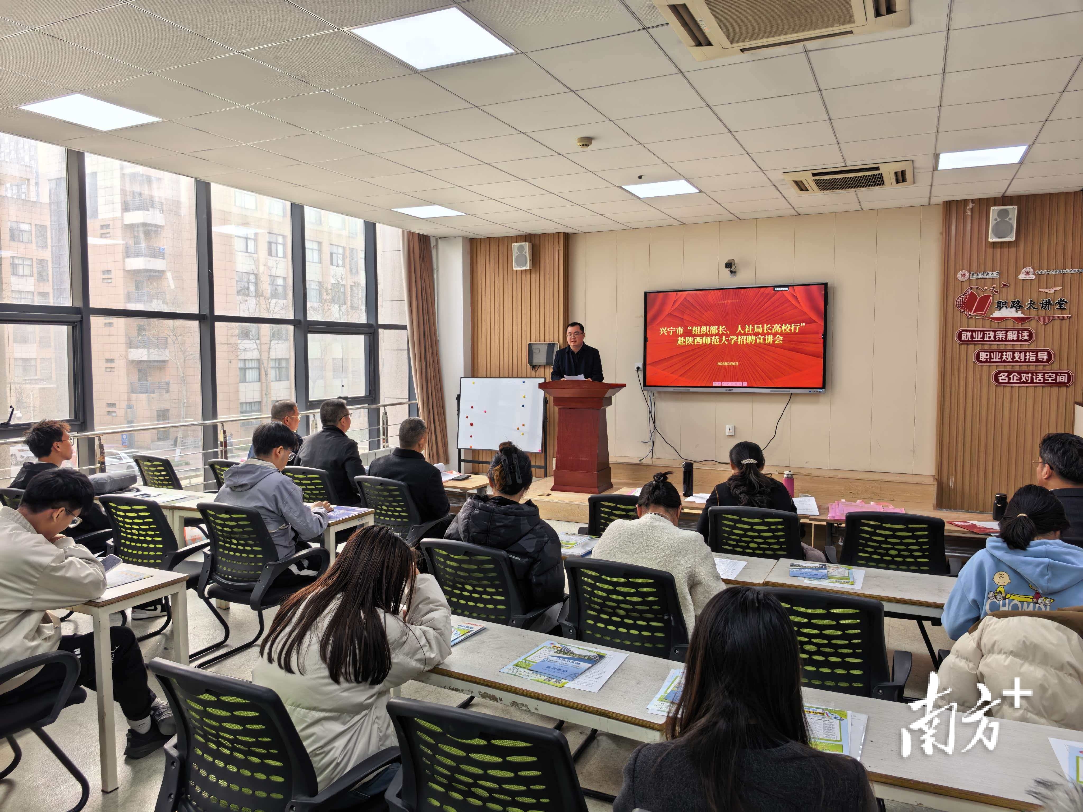 春启征程,才聚齐昌。为深入贯彻“百万英才汇南粤”2026年行动计划,纵深推进“才聚梅州大行动”,兴宁市以“开春即开跑”的奋斗姿态抢占春季引才先机,主动出击延揽优秀毕业生。近日,兴宁市委常委、组织部部长黄静宏率领市人力资源和社会保障局、市教育局、兴宁市第一中学等单位负责同志奔赴古都西安,走进教育部直属重点师范大学——陕西师范大学,开展“组织部长、人社局长高校行”活动。