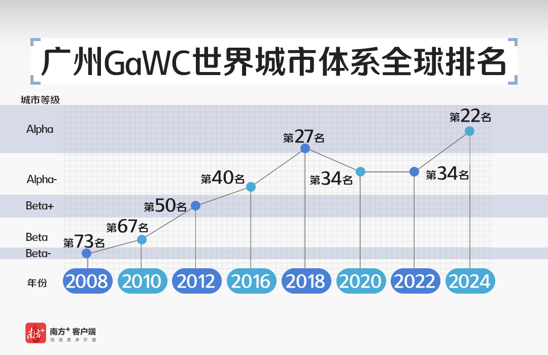 全球视野下,由“全球化与世界城市研究网络”(简称GaWC)发布的2024年世界城市体系排名中,广州位居第22位,稳居世界一线城市。