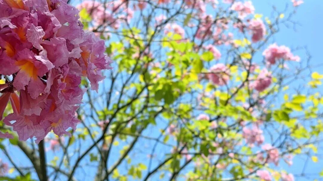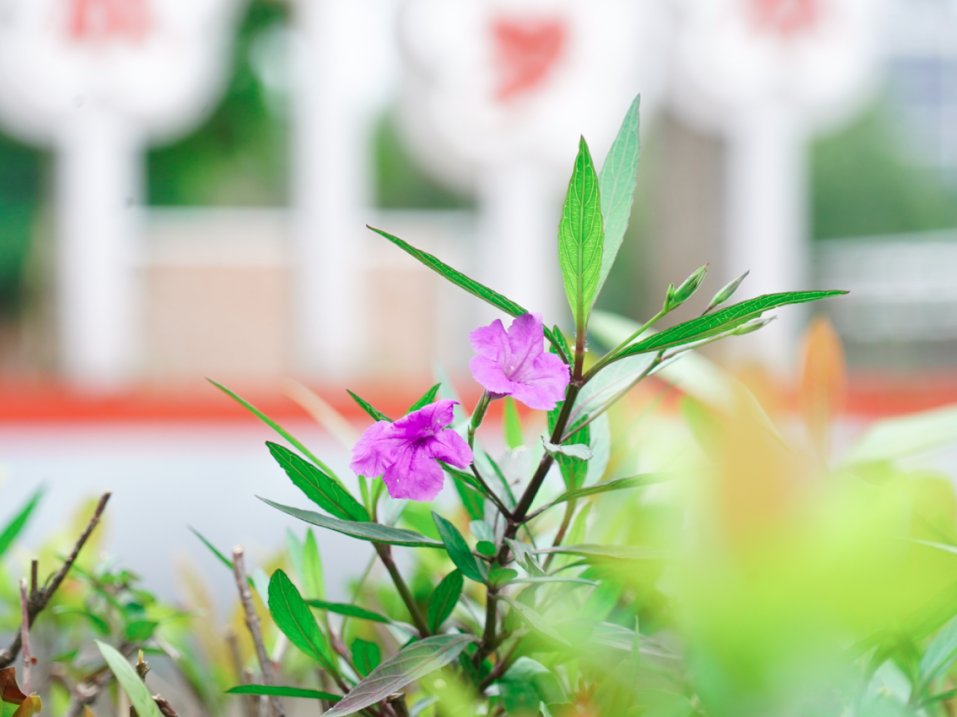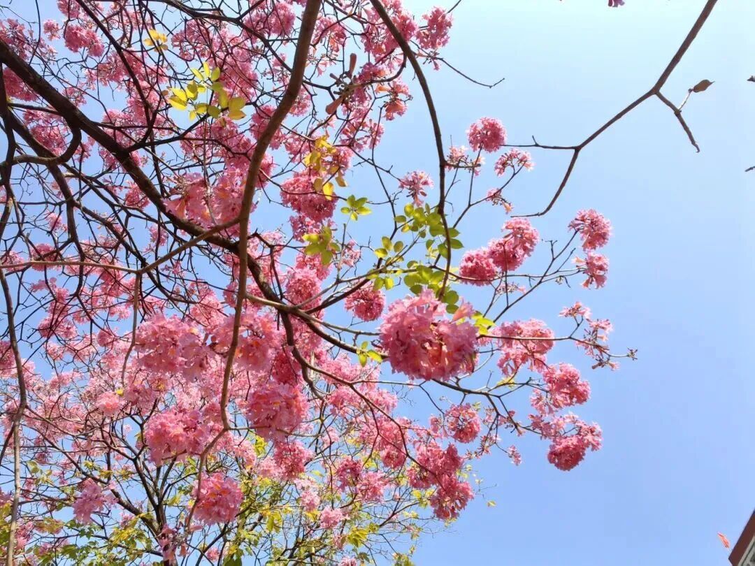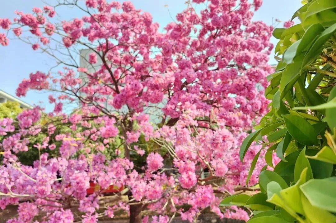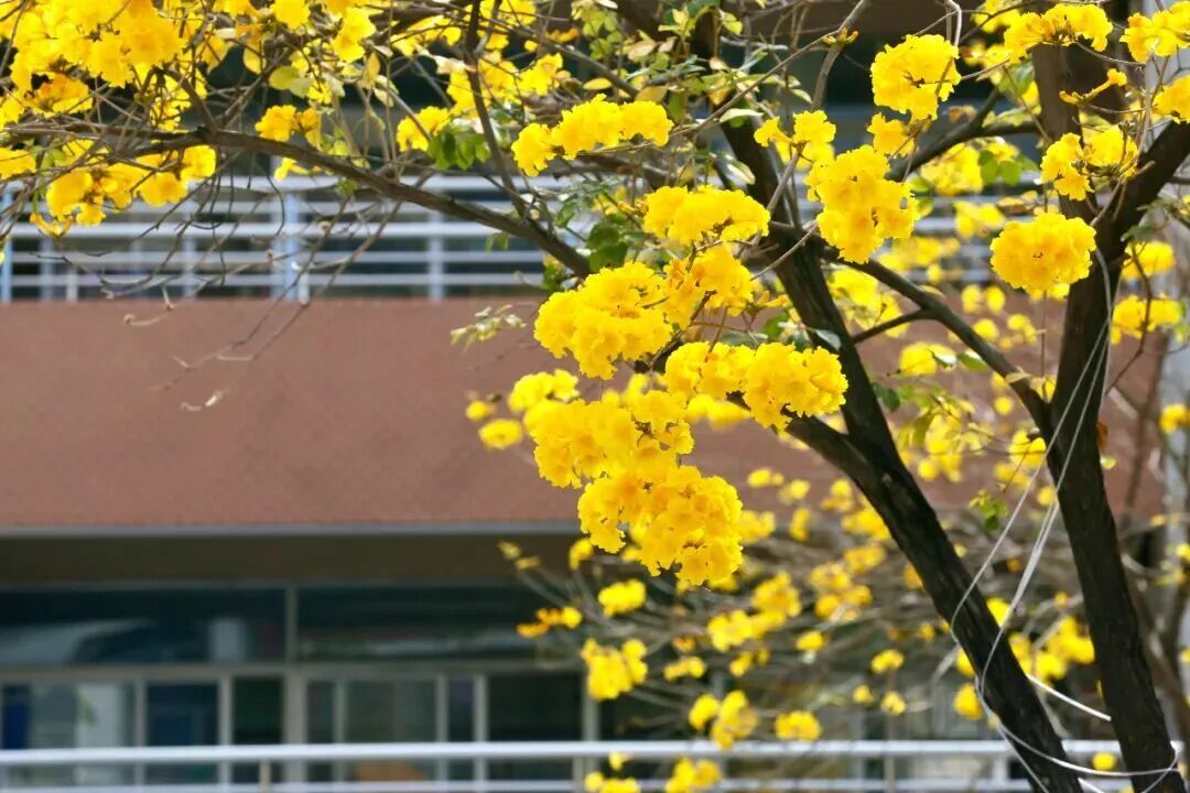 紫花风铃木在教学楼旁站成一排温柔,黄花风铃木把阳光穿在了身上,三角梅沿着围墙热烈地开着,一点也不害羞。