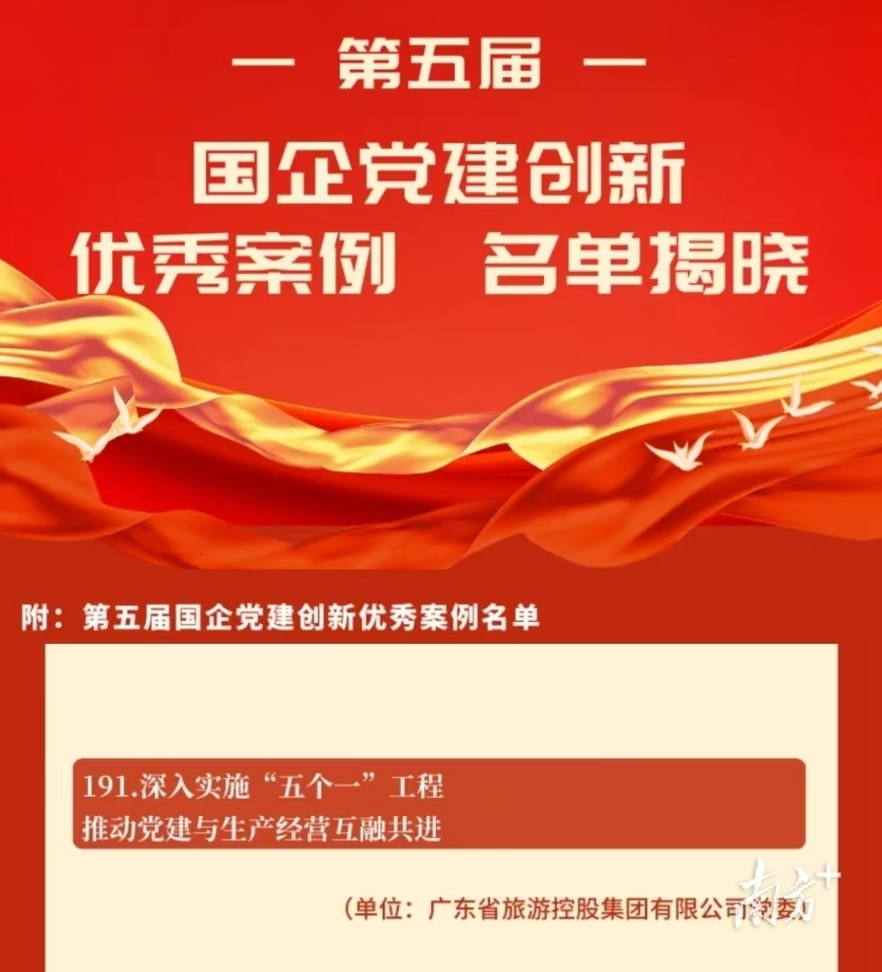 近年来,省旅游控股集团“五个一”高质量党建工程入选第五届国企党建创新优秀案例,“党建工作十条”荣获2025年国企党建创新实践技术成果二等奖,“445”思想政治工作体系获评广东省基层思想政治工作优秀案例一等奖,党建工作制度化、品牌化、实效化水平持续提升。
