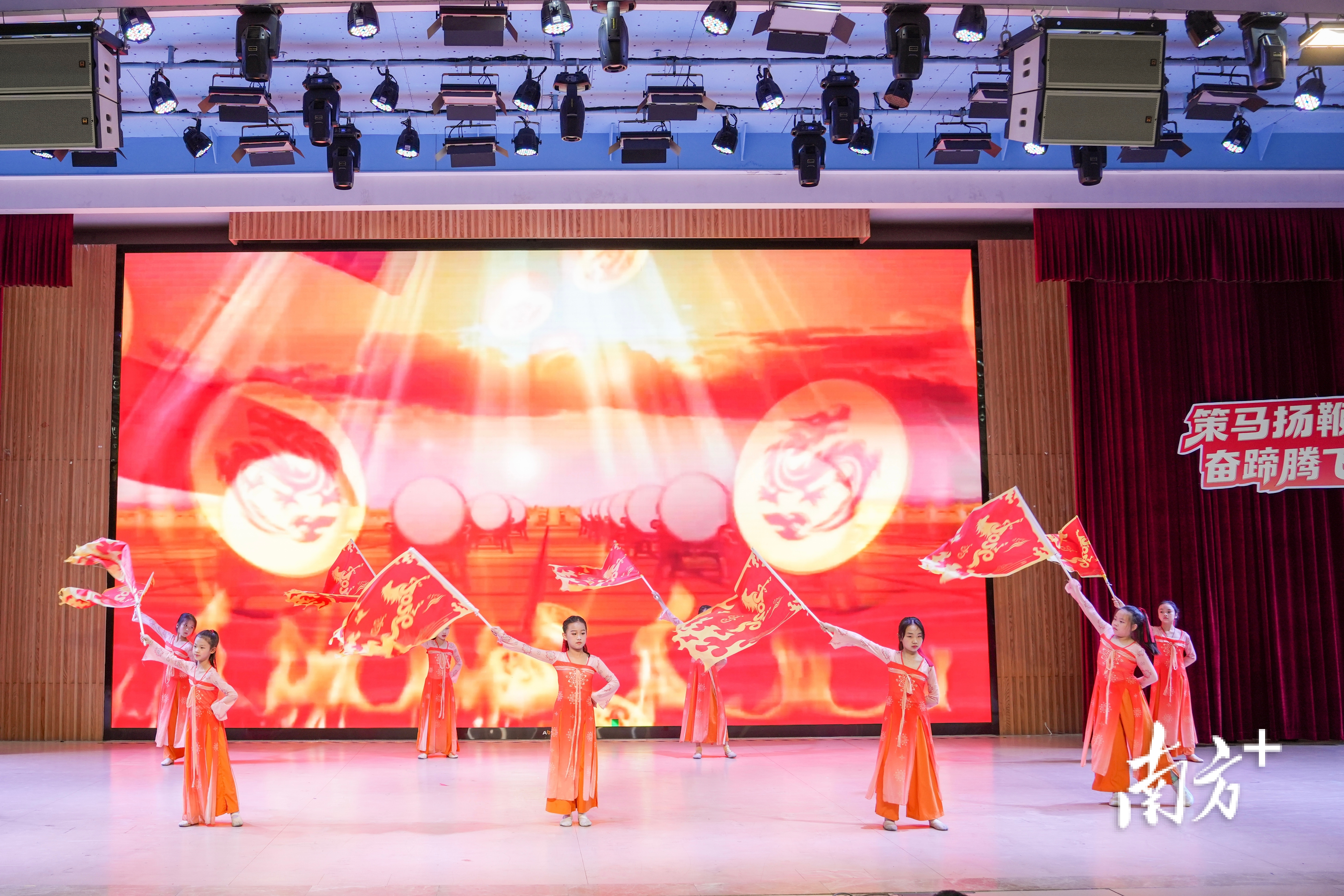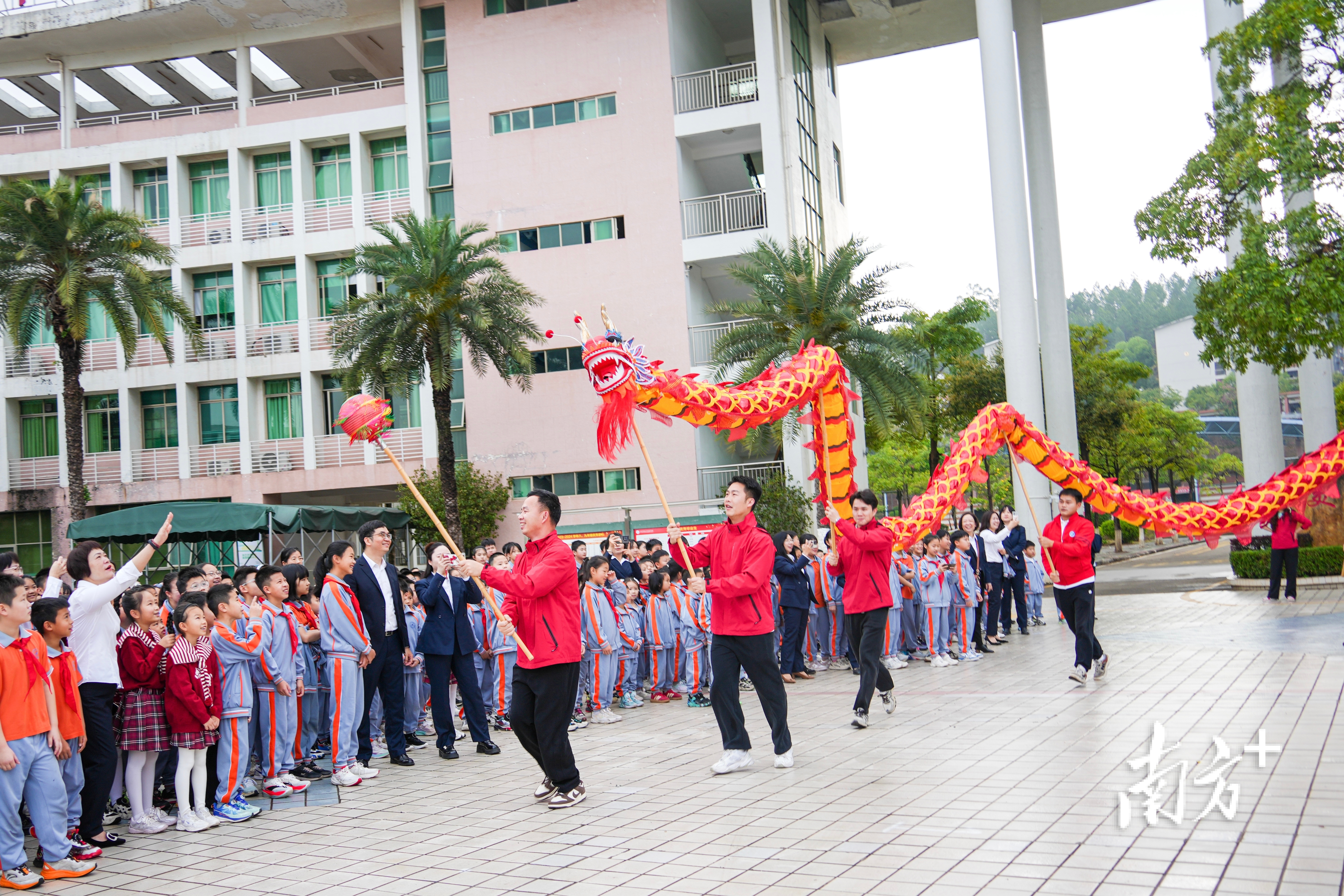 新春开学,年味未散。在河源市新河实验学校,校门口早早地就热闹开了。伴随着铿锵有力的锣鼓声,醒狮舞龙队伍欢呼雀跃,用最传统也最喜庆的方式,热烈欢迎返校的同学们。孩子们看得目不转睛,有学生忍不住蹲下身来,透过狮头下方好奇地看着演员。