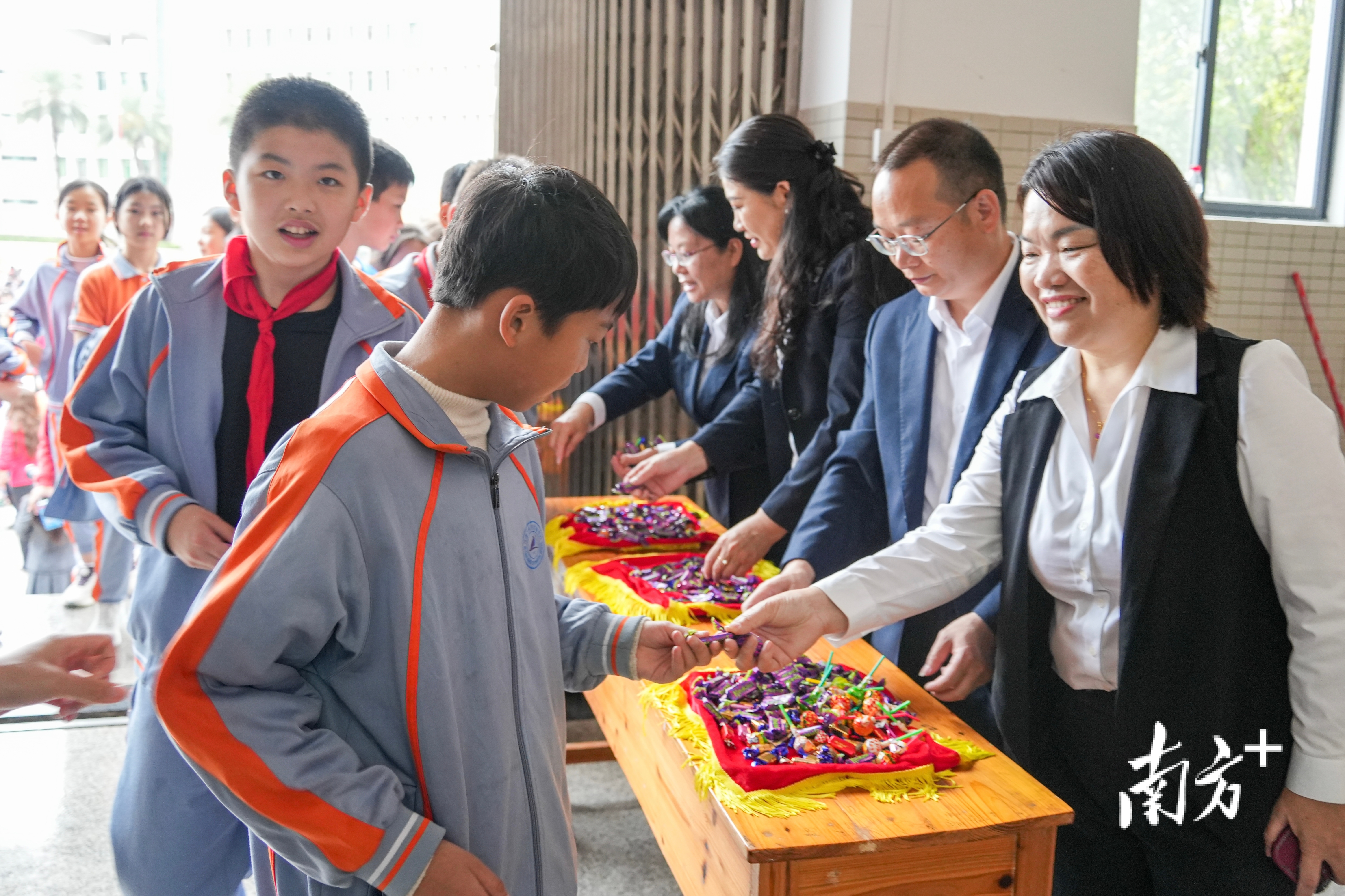 “新年好呀,欢迎回来!”学校教职工们一边招呼着,一边给踏入校门的孩子们递上新年糖果。接过甜蜜的祝福,孩子们的脸上也笑开了花。