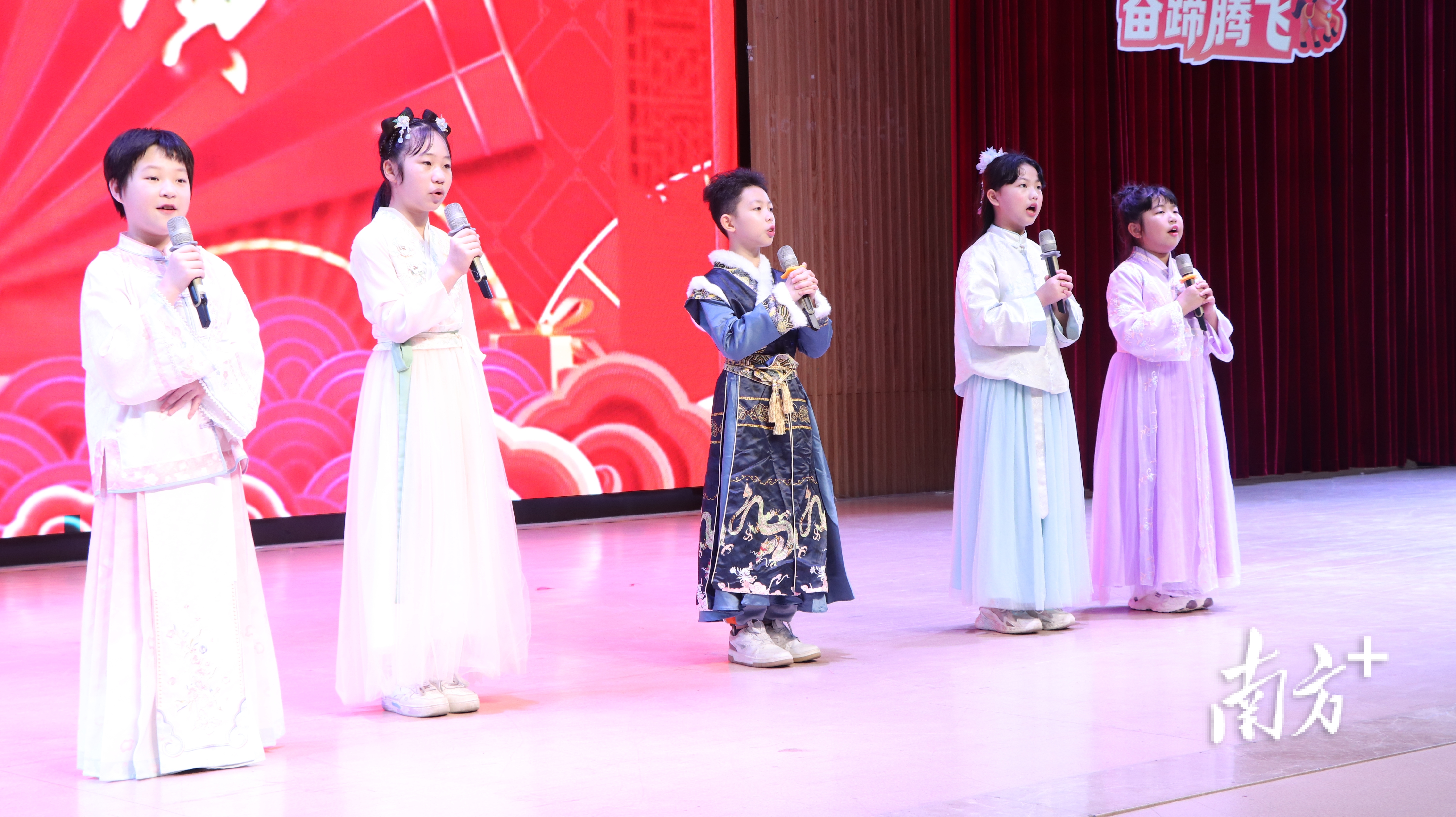 升旗仪式后,学校的开学典礼拉开帷幕。伴随着欢快的旋律,同学们带来了歌舞表演《我们开学了》,瞬间点燃了现场的气氛。紧接着上演《疯狂动物城元日派对》兔子朱迪、狐狸尼克等可爱有趣的动物角色在屏幕上舞动,更是引得全场欢呼。当表演中响起“千门万户瞳瞳日,总把新桃换旧符”的诗句时,许多同学不约而同地跟着大声朗诵起来,稚嫩而整齐的童声全场回荡,为新学期注入了满满的朝气与活力。