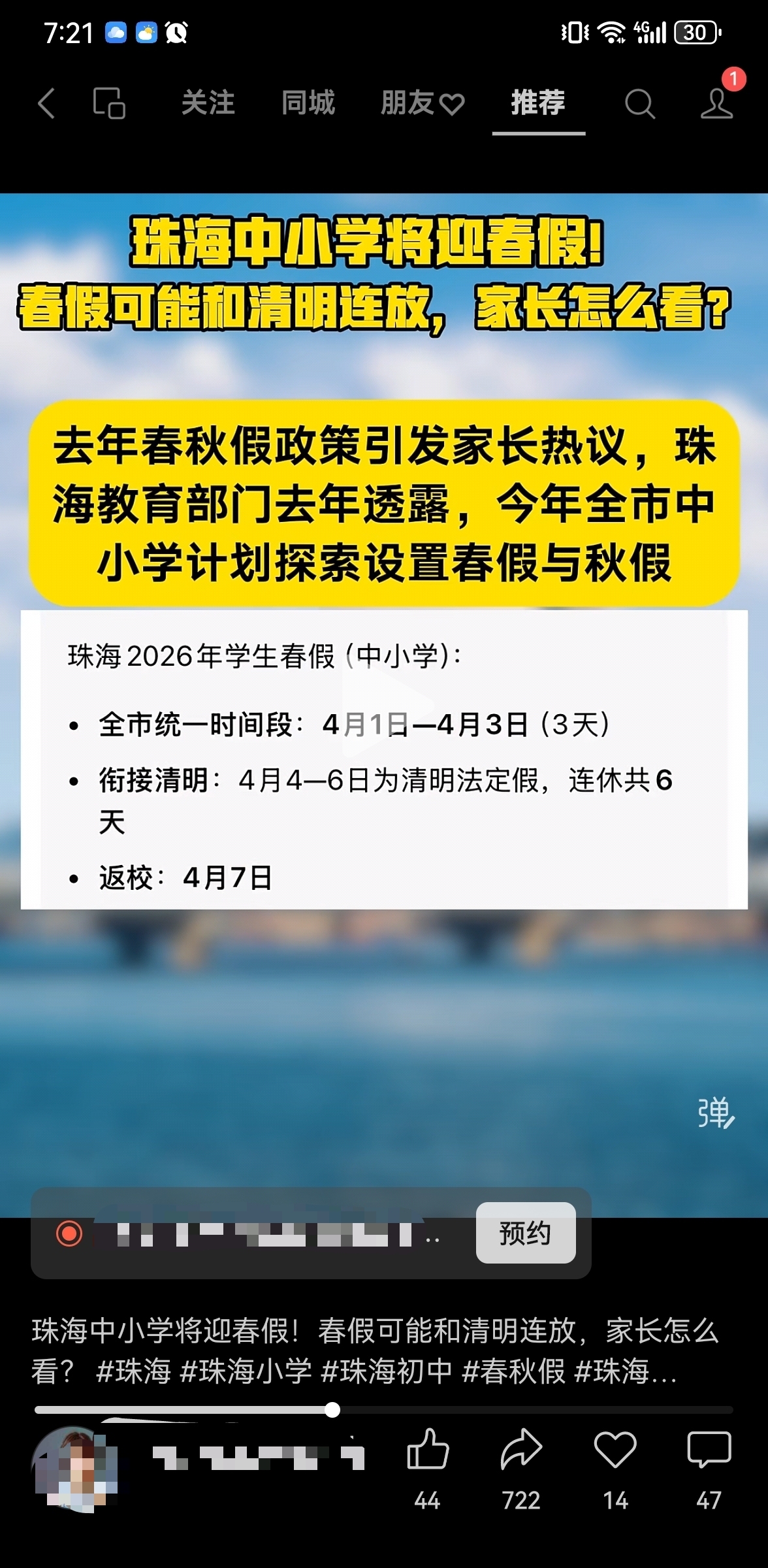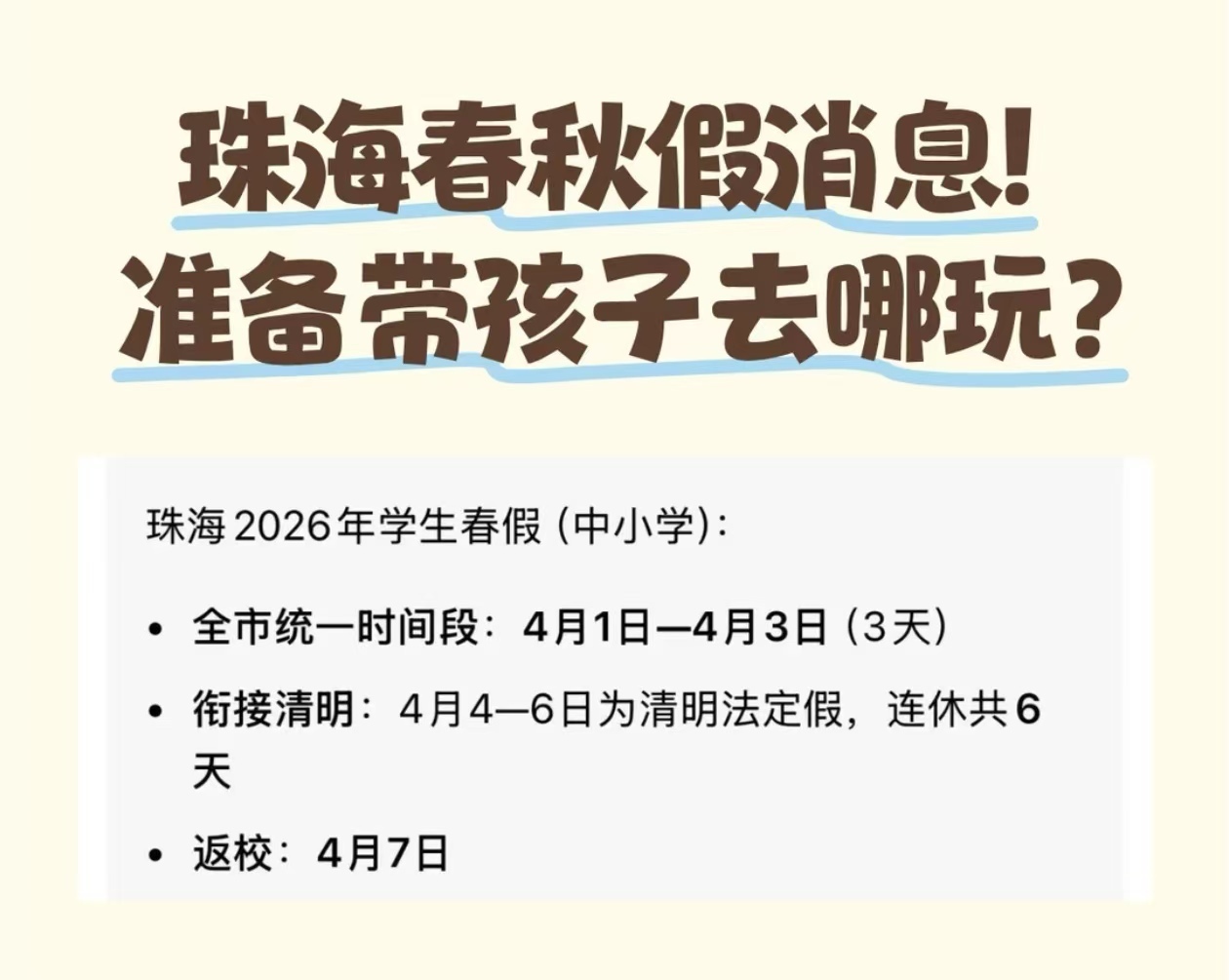 日前,部分自媒体和多个家长群发布珠海中小学春假消息,称4月1日—3日为全市中小学春假时间,与清明小长假衔接,最长假期为6天。
