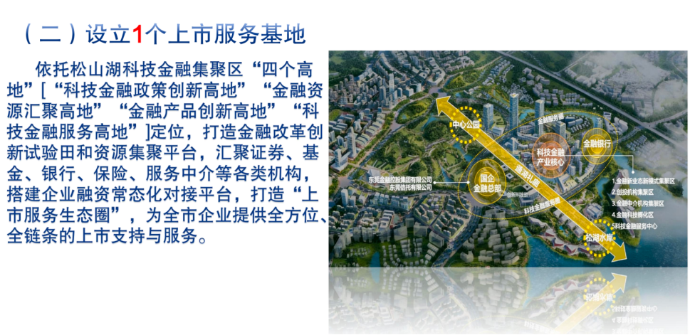 同时依托松山湖科技金融集聚区“四个高地”——科技金融政策创新高地、金融资源汇聚高地、金融产品创新高地、科技金融服务高地定位,打造金融改革创新试验田和资源集聚平台,汇聚证券、基金、银行、保险、服务中介等各类机构,搭建企业融资常态化对接平台,打造“上市服务生态圈”,为全市企业提供全方位、全链条的上市支持与服务。