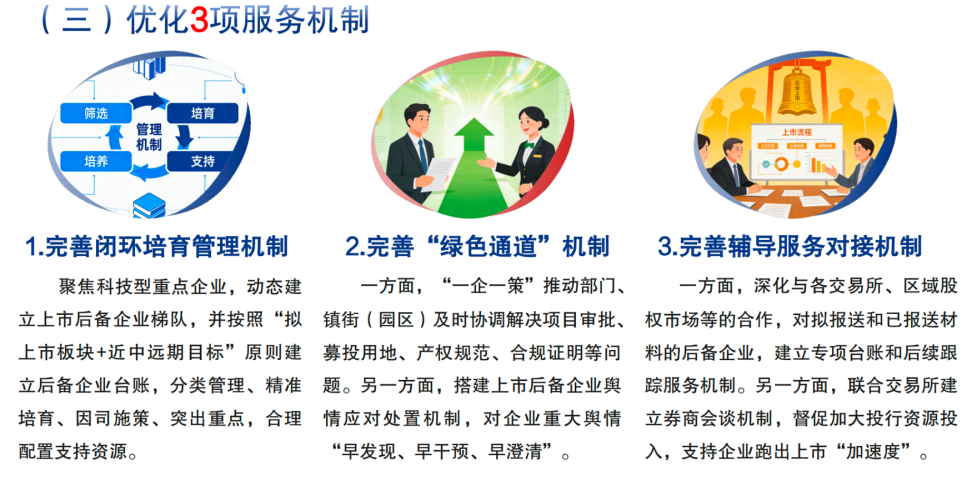 三是完善辅导服务对接机制,着力打通企业上市“最后一公里”。一方面,深化与各交易所、区域股权市场、中介机构的合作,对拟报送和已报送材料的后备企业,建立专项台账和后续跟踪服务机制,对重点企业提供“一对一”上市辅导服务,引导科学规划上市路径。另一方面,建立券商会谈机制,督促加大投行资源投入,为企业上市提供既高质又高效的辅导服务,提升申报材料质量,助力企业加快上市。