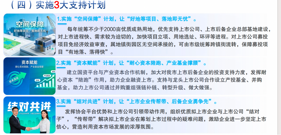 一是实施“空间保障”计划,让“好地等项目、落地即无忧”。每年统筹不少于2000亩优质成熟用地及优质办公用房,优先支持上市公司、上市后备企业总部基地建设,对上市进程快、需求迫切的,加快项目立项、用地选址、环评等进程。对上市公司募投项目免经济效益审查,属地镇街园区无空间承接的,可由市级统筹跨镇街流转,保障募投项目“有地落、落得快”,全力支持扎根东莞。
