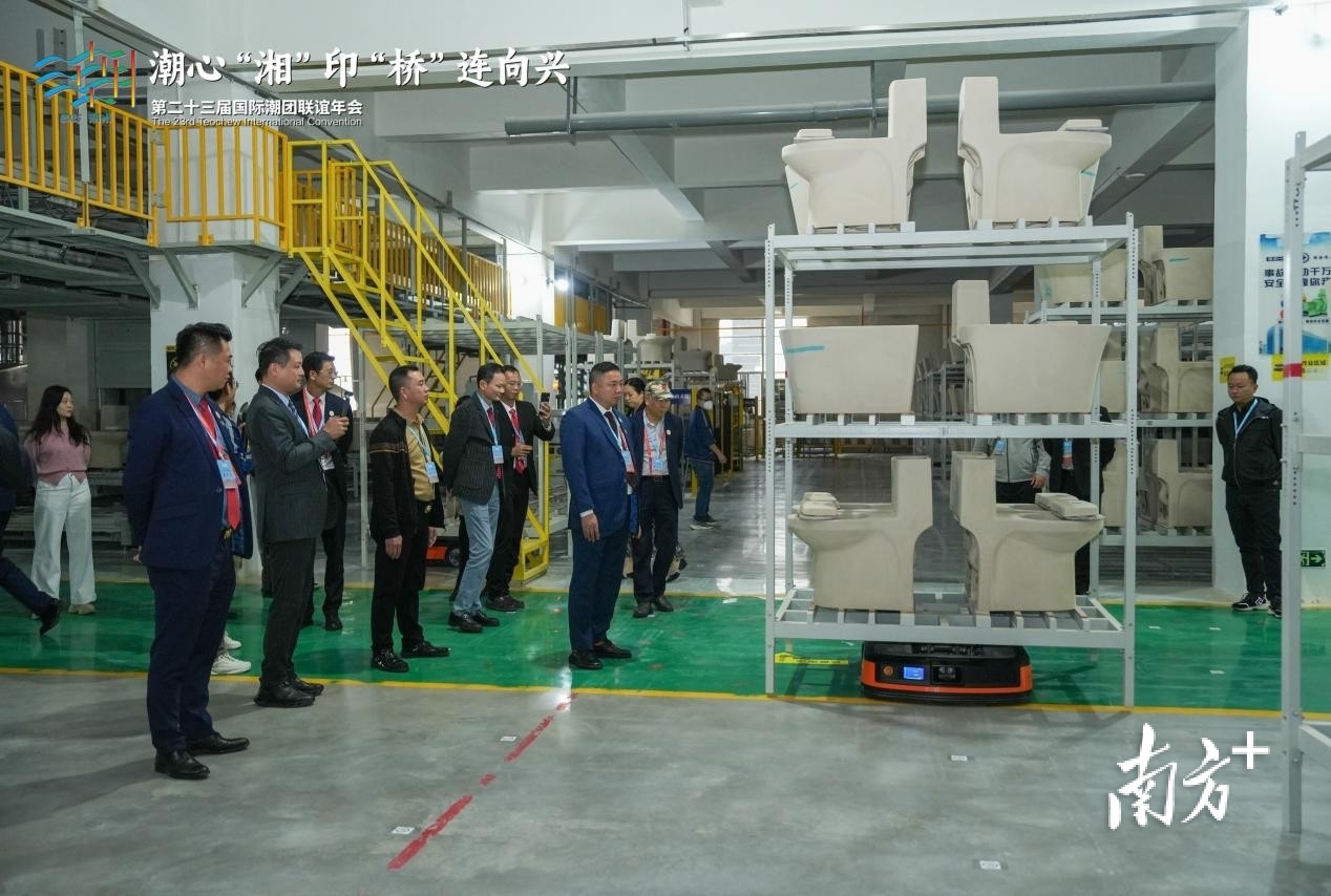 广东恒洁卫浴的智能化生产车间里,工业机器人精准抓取物料,AGV智能车穿梭不停。这一场景让张学彬印象深刻:“湘桥区工业区布局规范,自动化程度比我想象中高,技术实力不逊国外企业。”