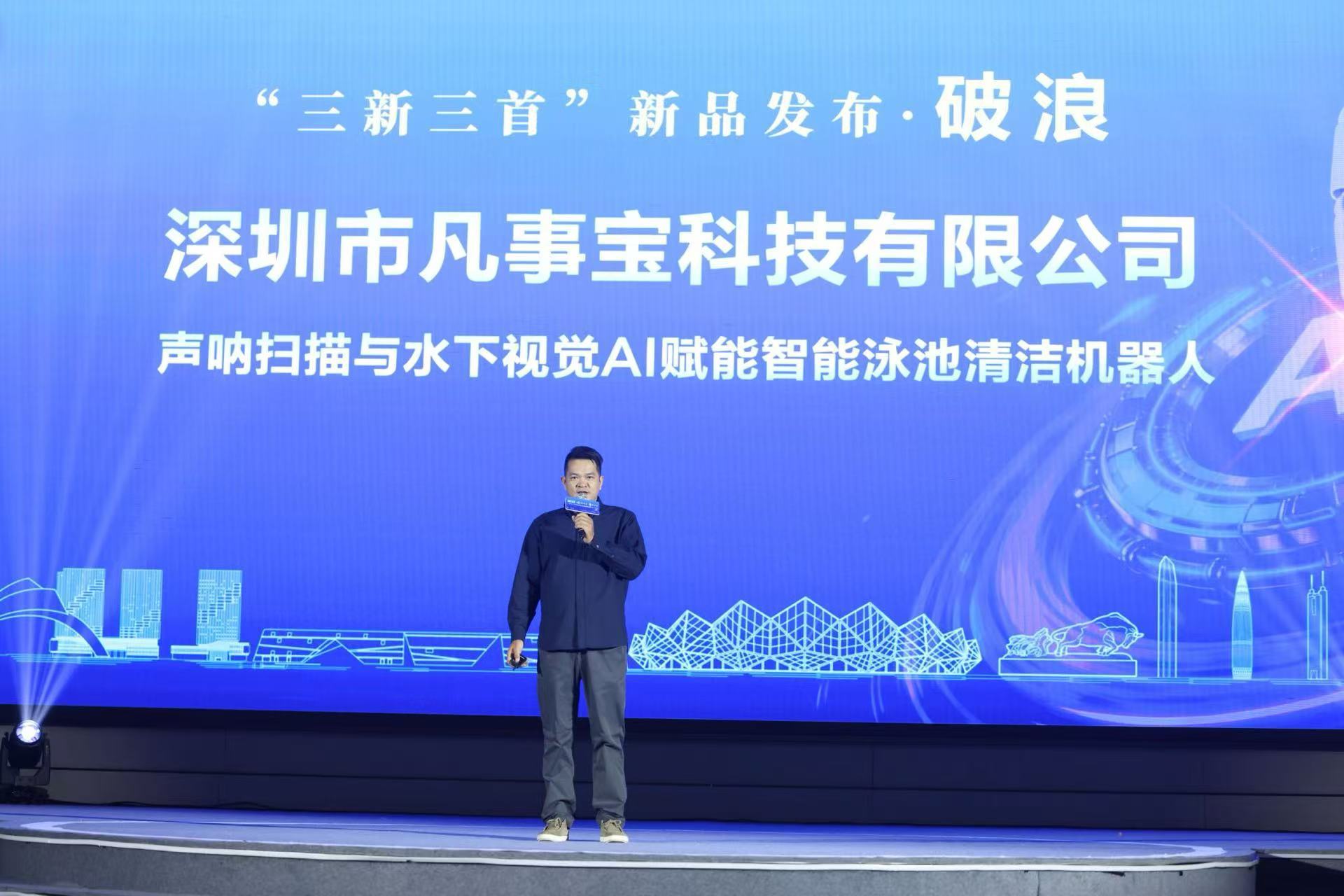 最后压轴登场的是深圳市凡事宝科技有限公司,这家专注水下智能机器人研发的科技公司发布的是智能泳池清洁机器人。据介绍,该产品内含单波束声呐扫描传感器和水下视觉AI系统,能解决泳池清洁机器人“盲扫”与路径难固定的问题,实现产品基于精准地图的自适应清洁,同时具备防溺水安全监控功能,适用于私人及商业泳池,尤其擅长中大型、异形池体与水上乐园等复杂场景。