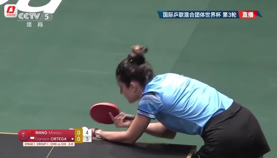 第二场较量是女单比赛,中国队派出王曼昱,智利队出战的是奥尔特加。实力颇具优势的王曼昱11-4、11-4、11-8连赢三局,将大比分改写为6-0。