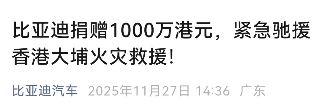 比亚迪官微14时36分宣布捐赠1000万港元,紧急驰援香港大埔火灾救援。并向所有奋战一线的消防及救援人员,致以崇高敬意。