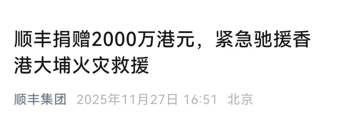 据顺丰集团公众号27日16时51分消息,顺丰启动应急响应机制,第一时间捐赠2000万港元,用于受灾居民的医疗救助、生活物资保障以及灾后重建。11月27日起,开放全港146个顺丰站,提供免费救援物资运输服务。同时,顺丰香港成立了义工队,全力协助救援工作。