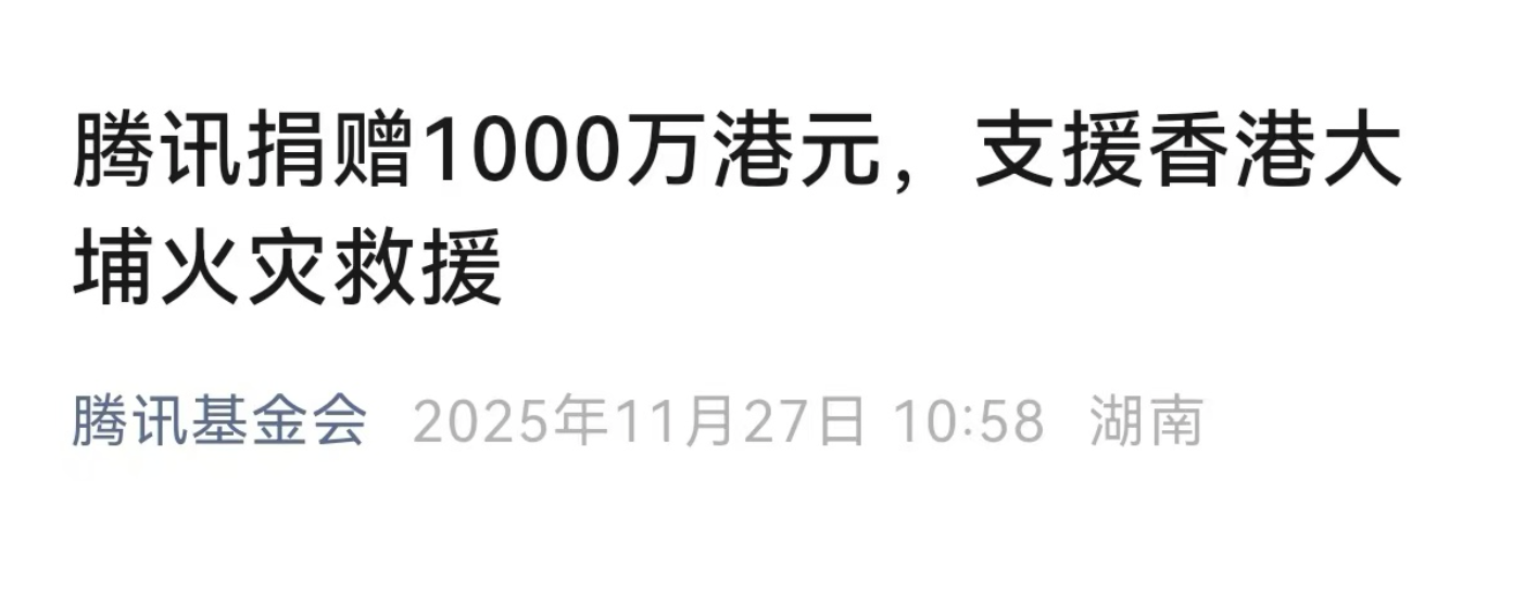 据腾讯基金会公众号27日10时58分消息,腾讯公益慈善基金会(香港)启动首批捐款1000万港元,用于受灾居民的紧急救援、过渡安置、生活物资补给及情绪疏导等急需工作。