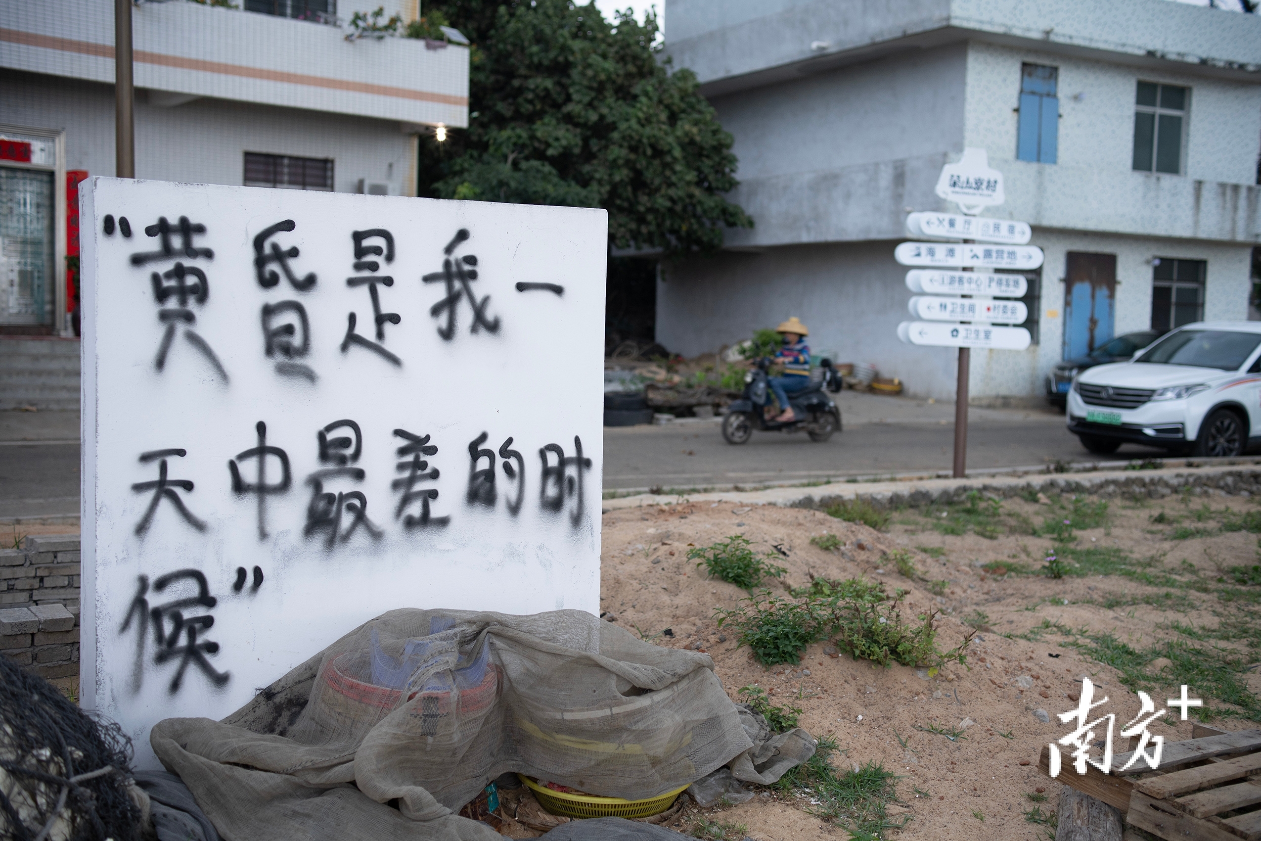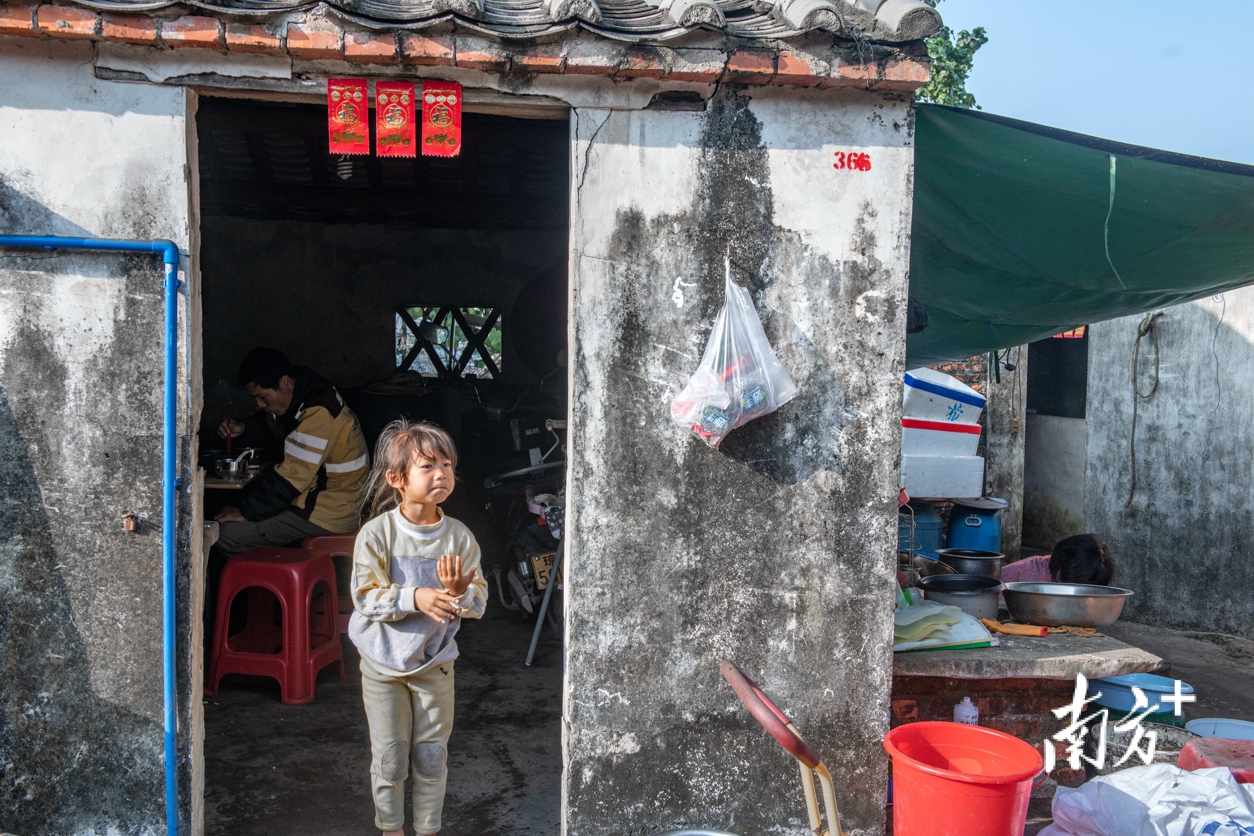 2024年2月17日,靠近沙滩边的简易房子及渔民一家,这就是现在渔村的“寮”。