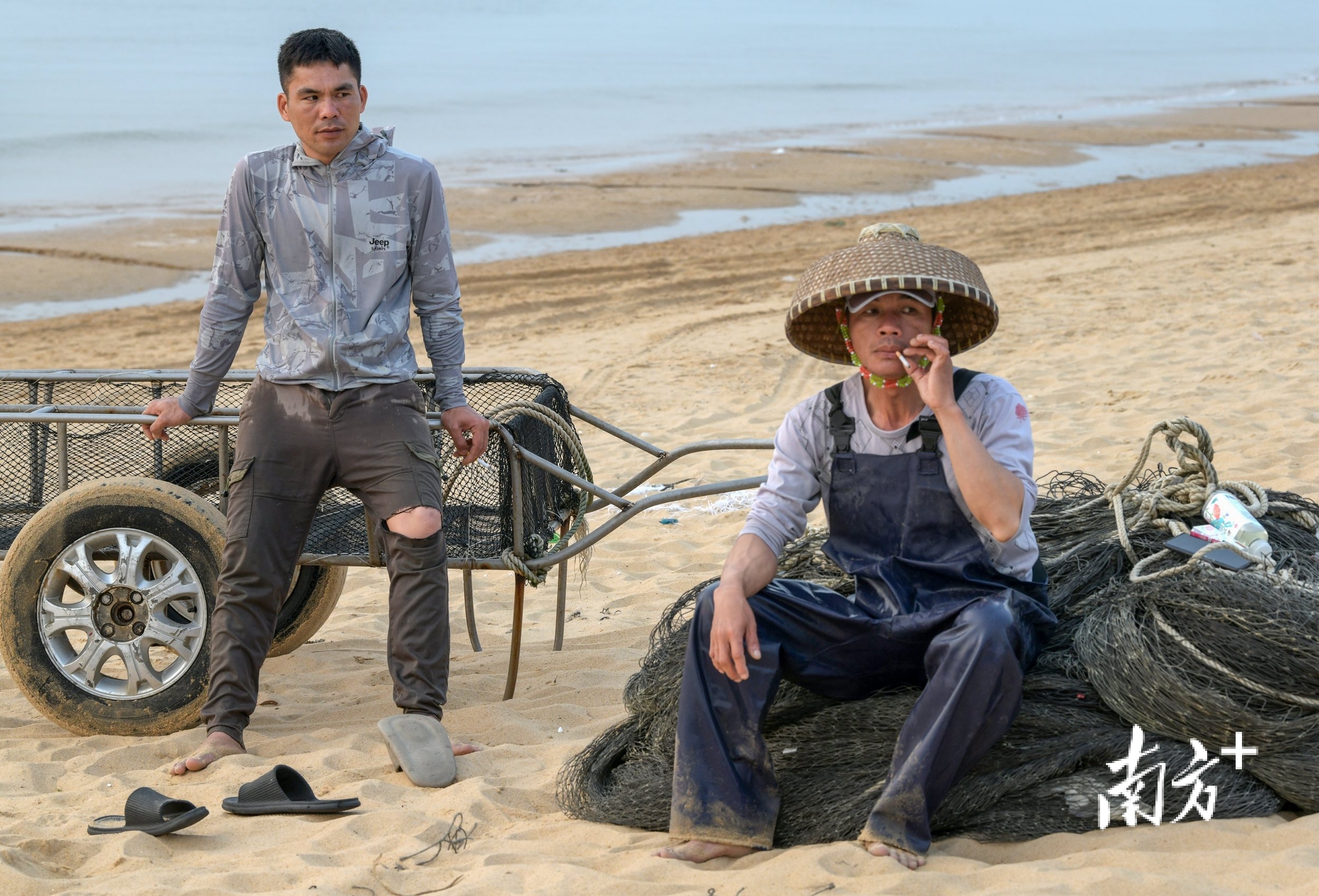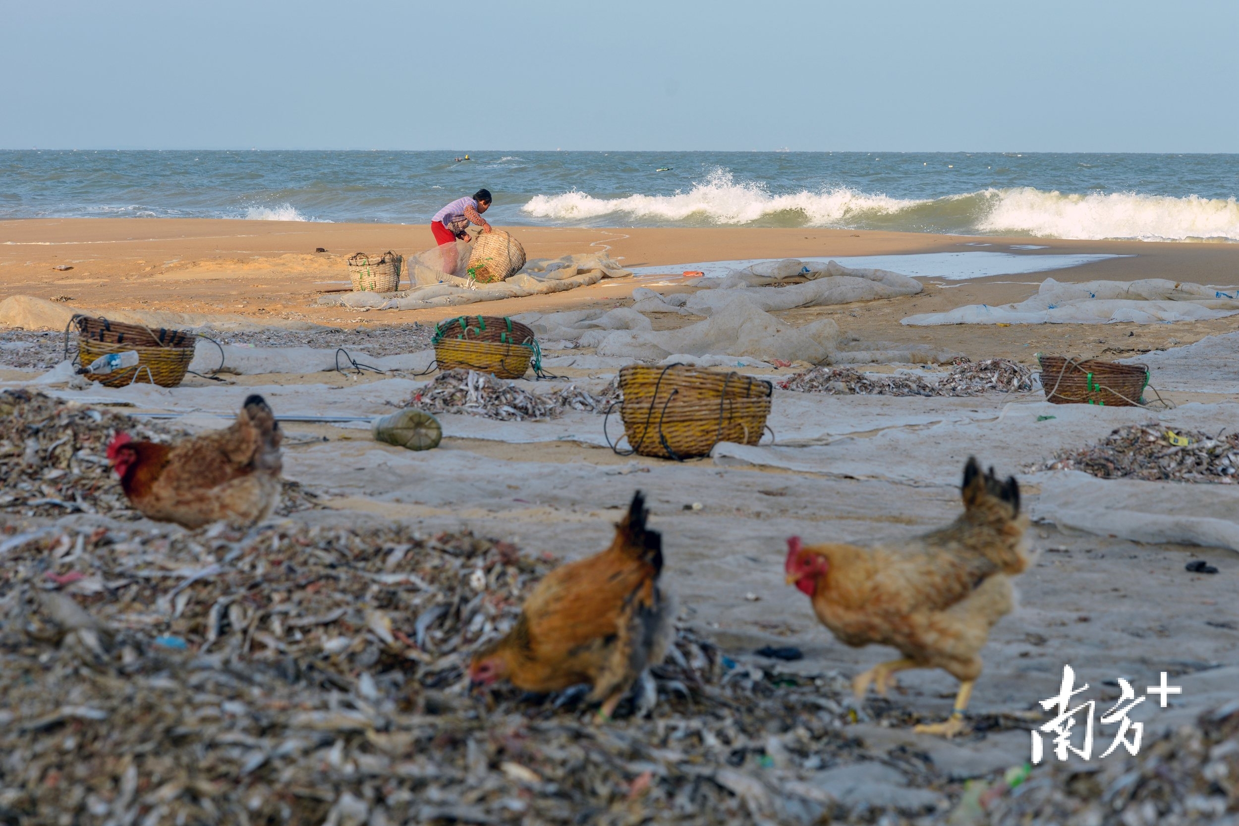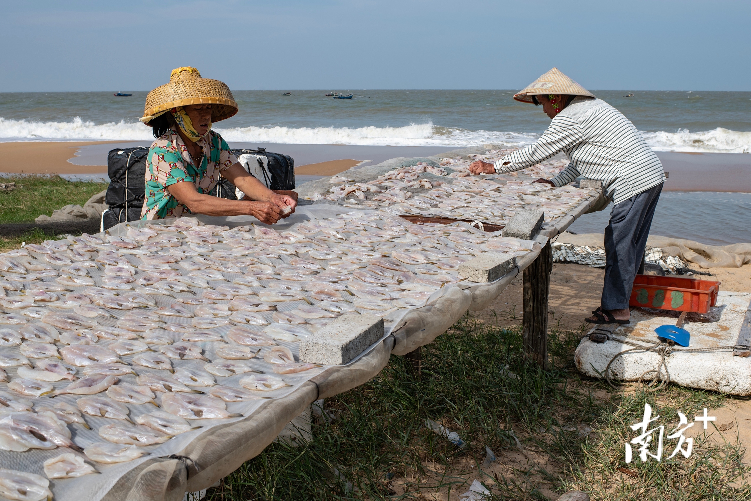 2024年2月18日,晨光照在沙滩上,戴着海南人喜欢使用传统竹斗笠的渔民正忙于分拣渔获。