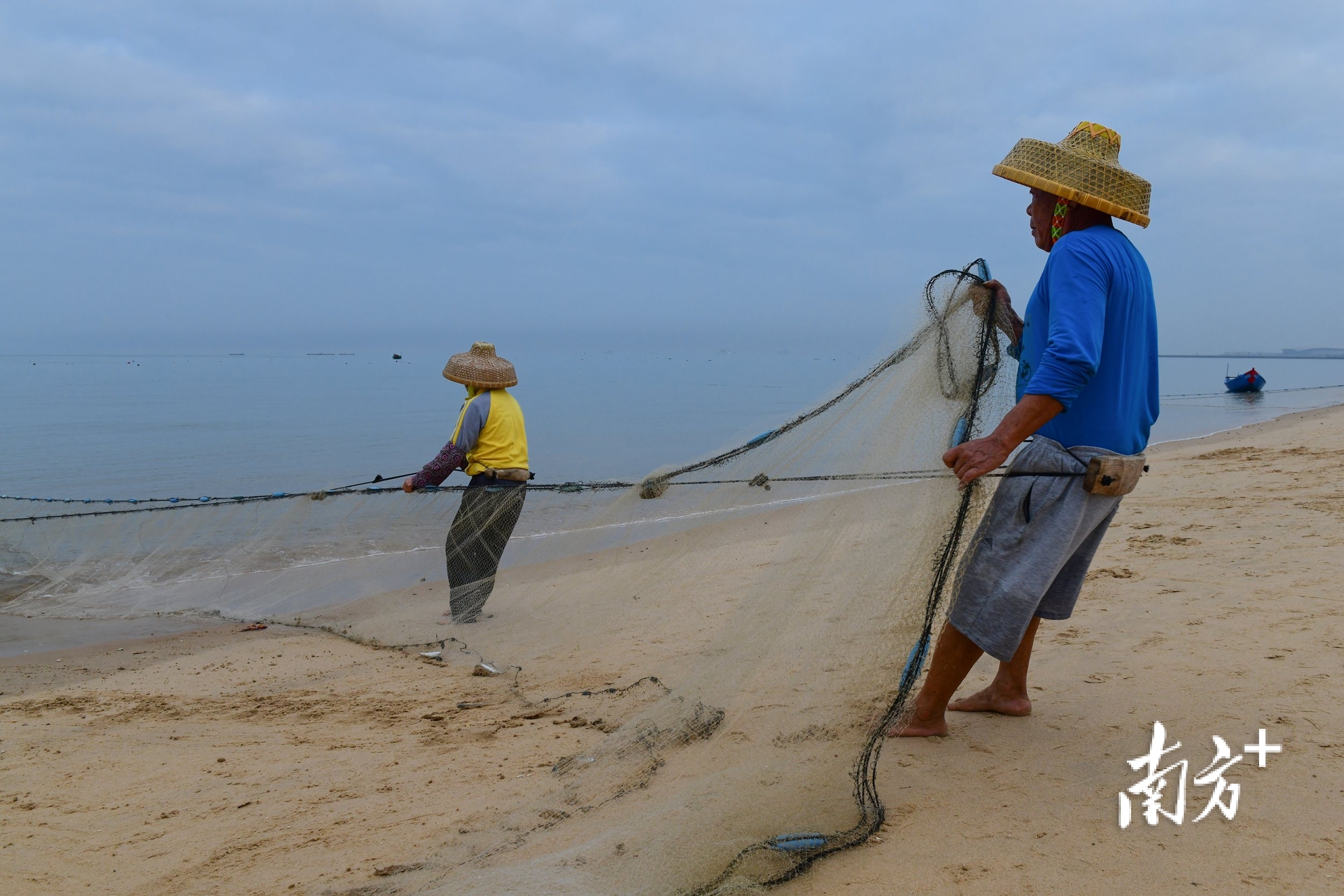 2024年2月15日,渔民在沙滩拉网。