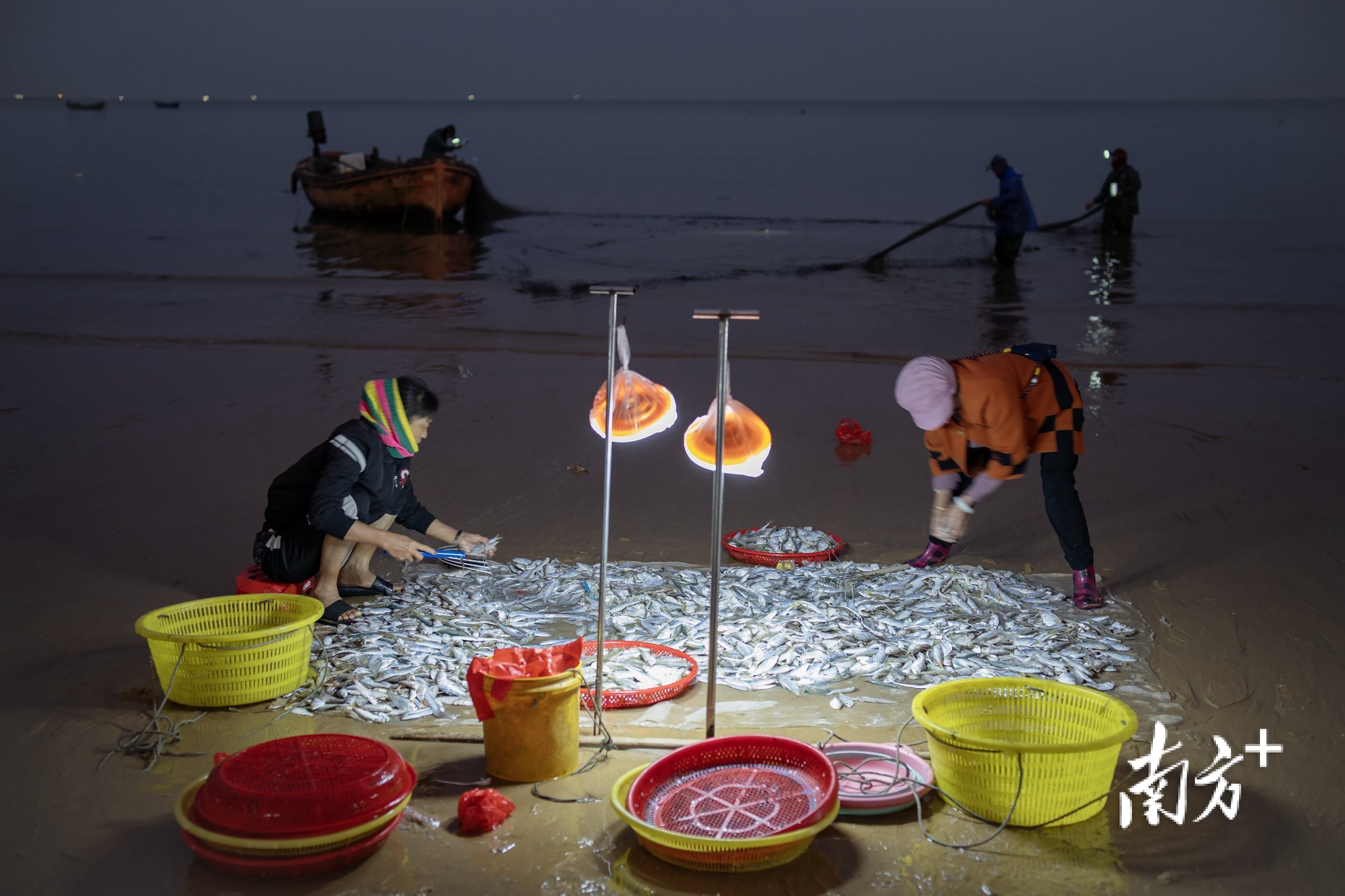 2025年4月4日,渔民在沙滩上挑灯分拣鱼获。