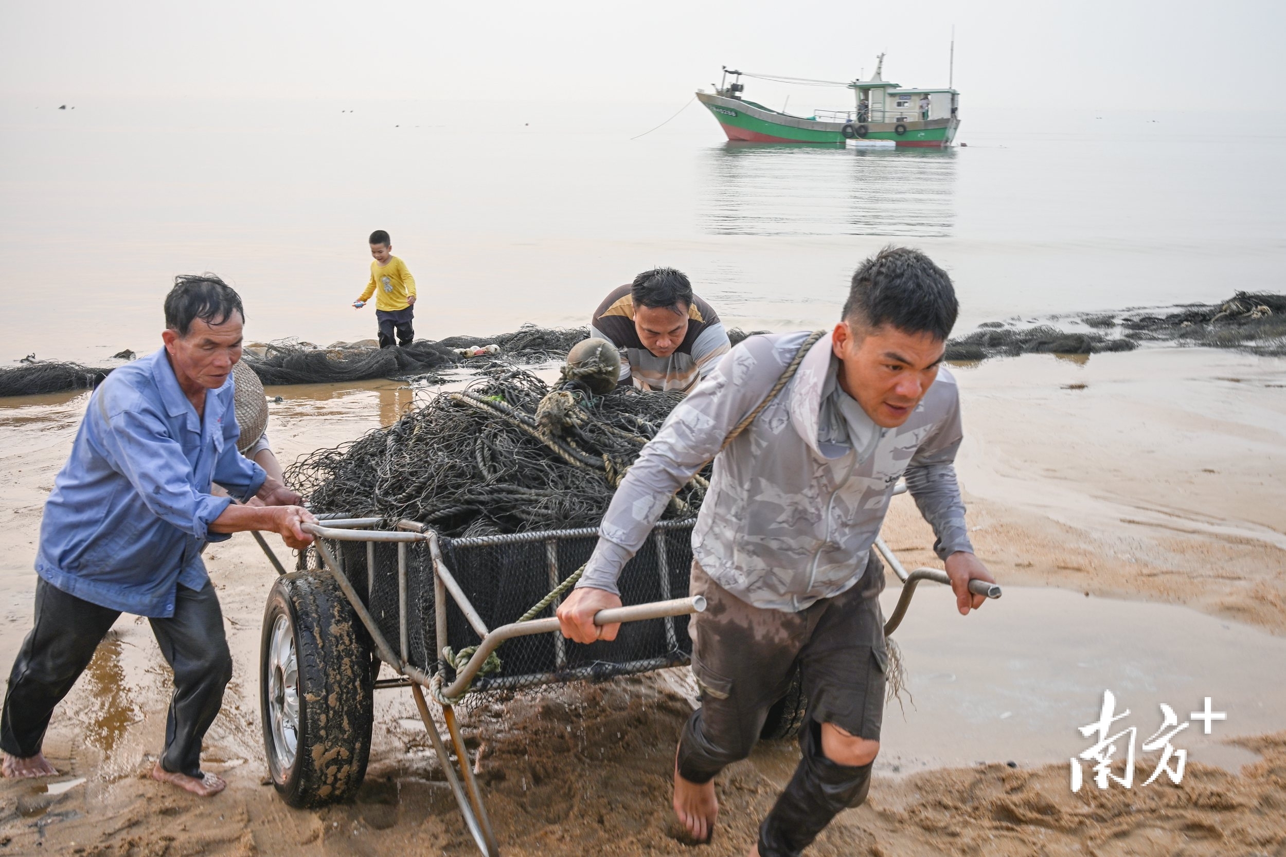 2025年3月28日,渔民正在合力把渔网从海边推到沙滩上晾晒,大渔网需要推车搬运。