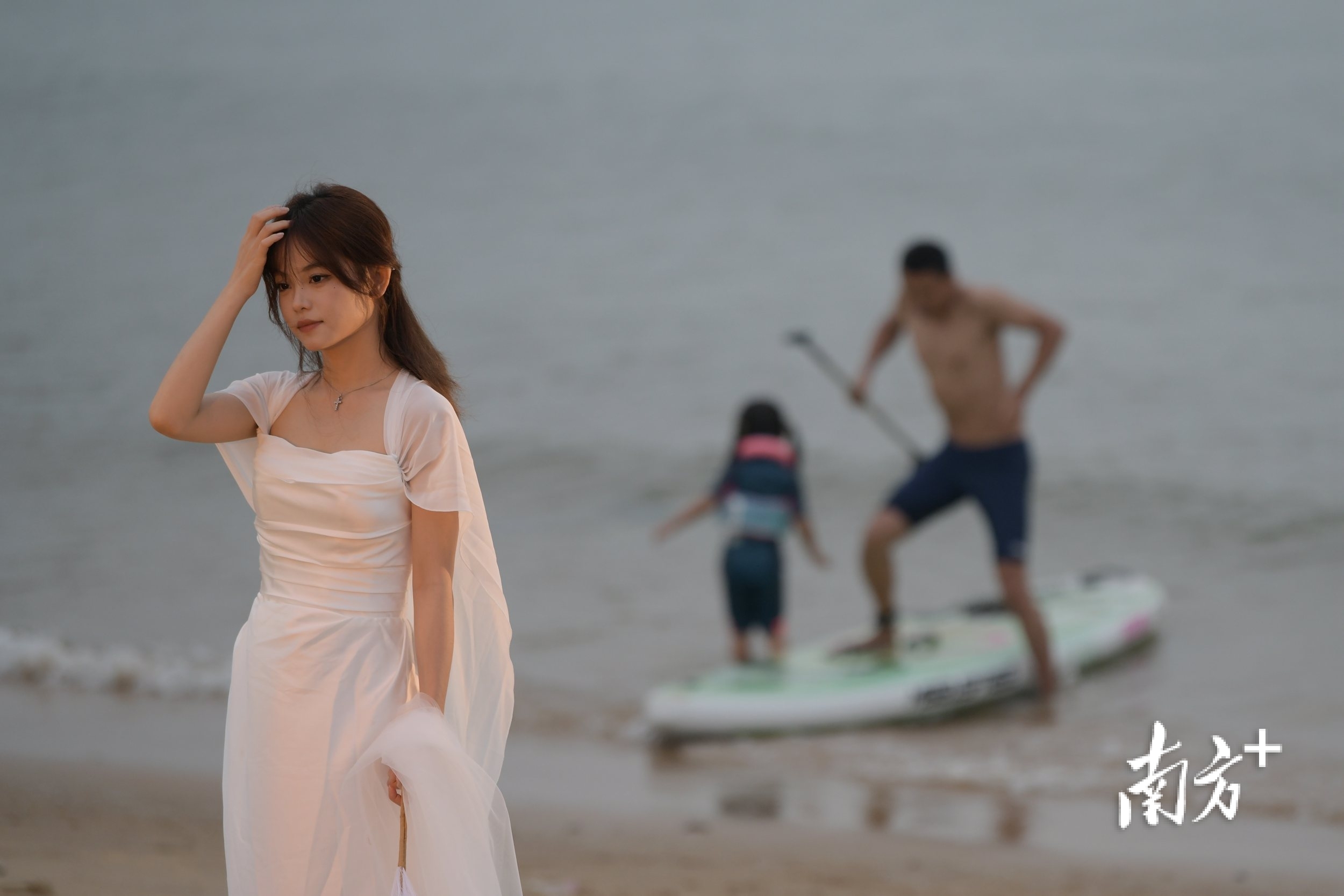 2025年3月28日,在海边拍人像的女孩,背后是水上娱乐项目,一对父女在试水上滑艇。