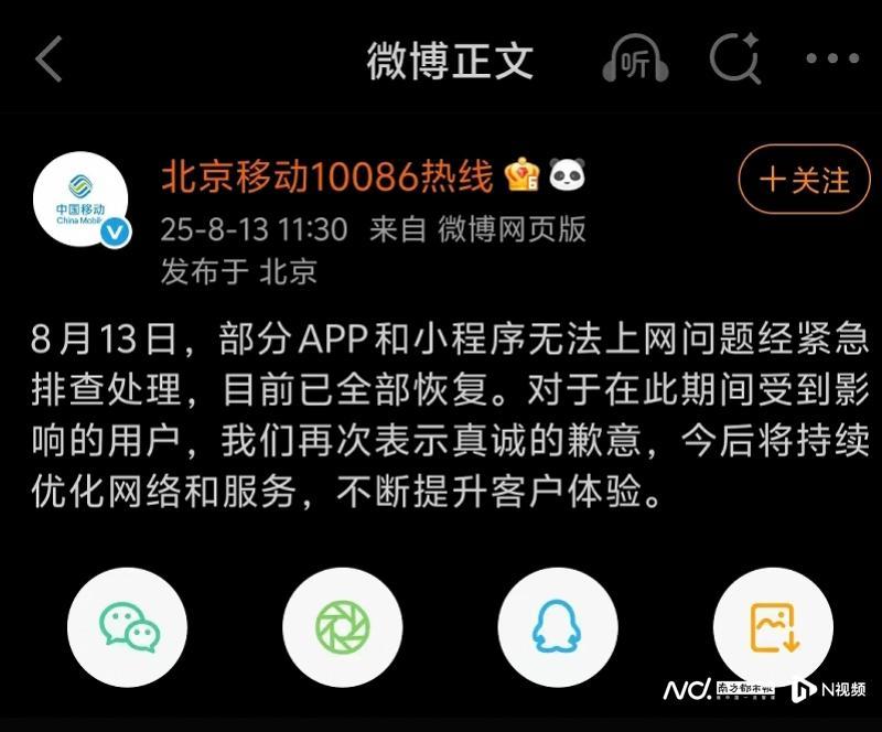 据悉,2025年8月13日凌晨至上午,北京移动网络出现异常,导致部分用户无法正常使用打车、支付等应用。