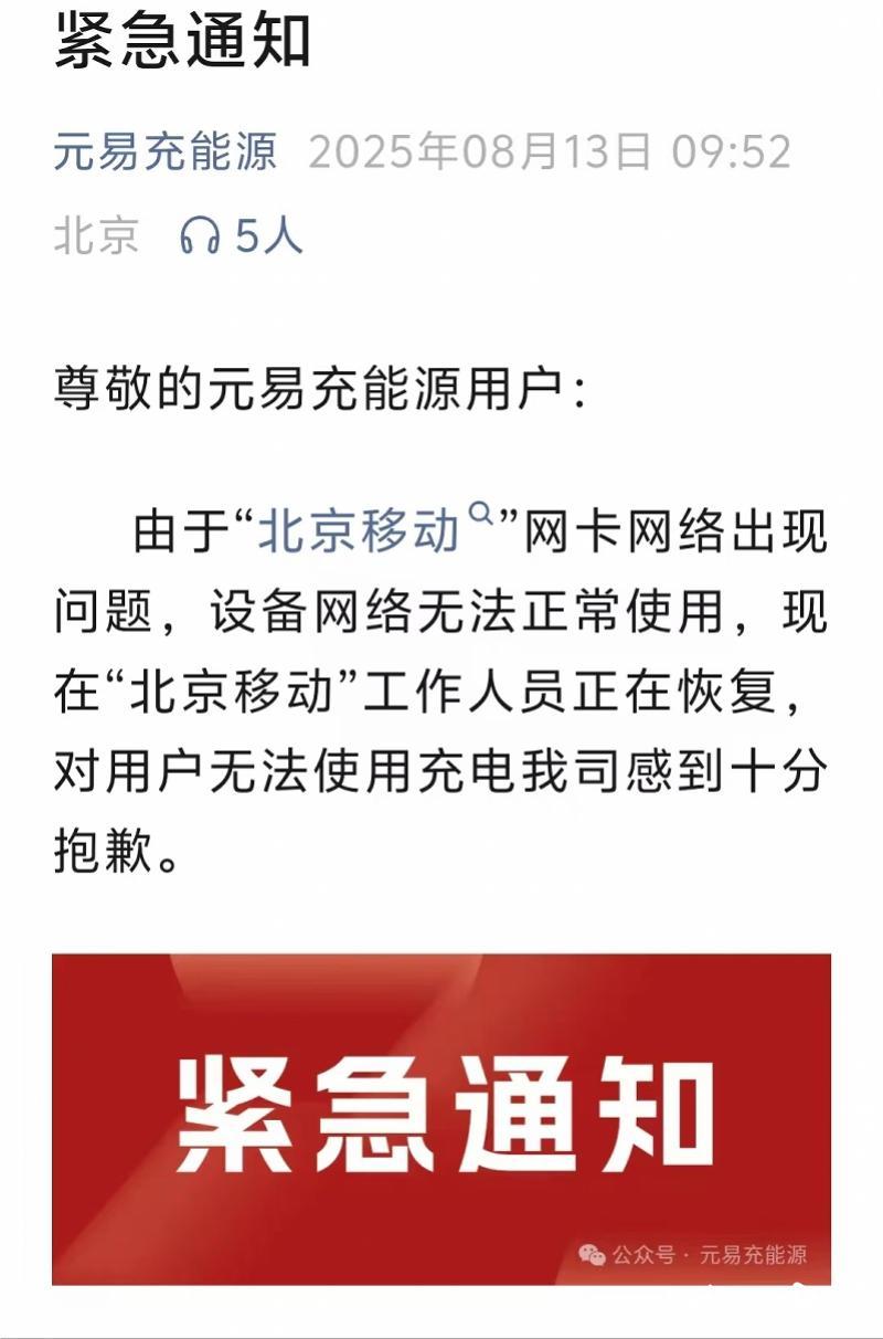 南都湾财社记者注意到,不少受影响企业对此发布公告的。如“元易充能源”公众号在当天9点52分时发文:尊敬的元易充能源用户,由于“北京移动”网卡网络出现问题,设备网络无法正常使用,现在“北京移动”工作人员正在恢复,对用户无法使用充电我司感到十分抱歉。