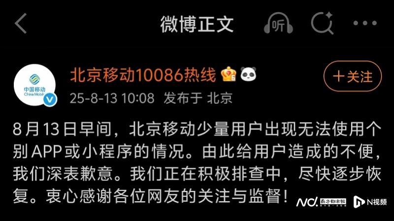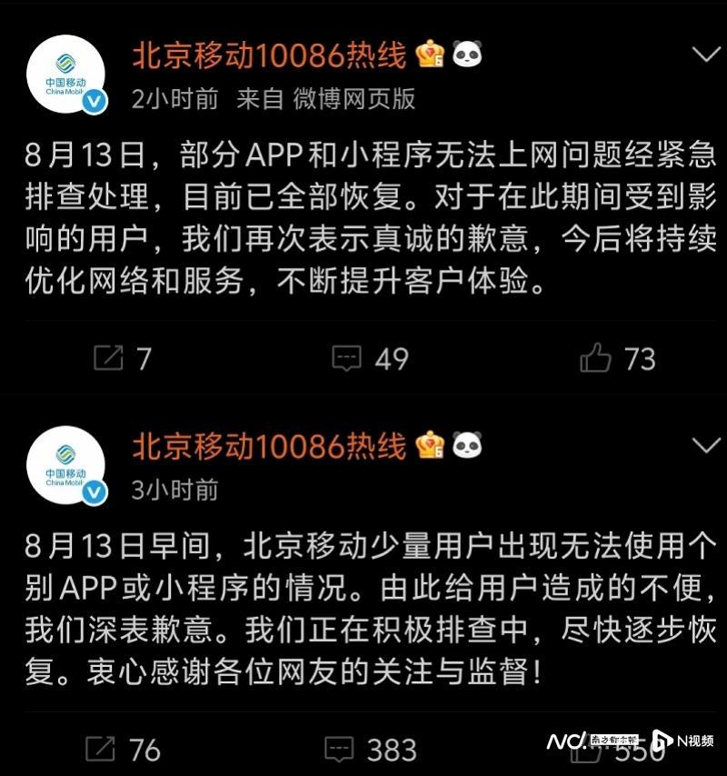 对此,当天早上10点时,中国移动北京公司官方微博发布消息:8月13日早间,北京移动少量用户出现无法使用个别APP或小程序的情况。由此给用户造成的不便,我们深表歉意。我们正在积极排查中,尽快逐步恢复。衷心感谢各位网友的关注与监督!