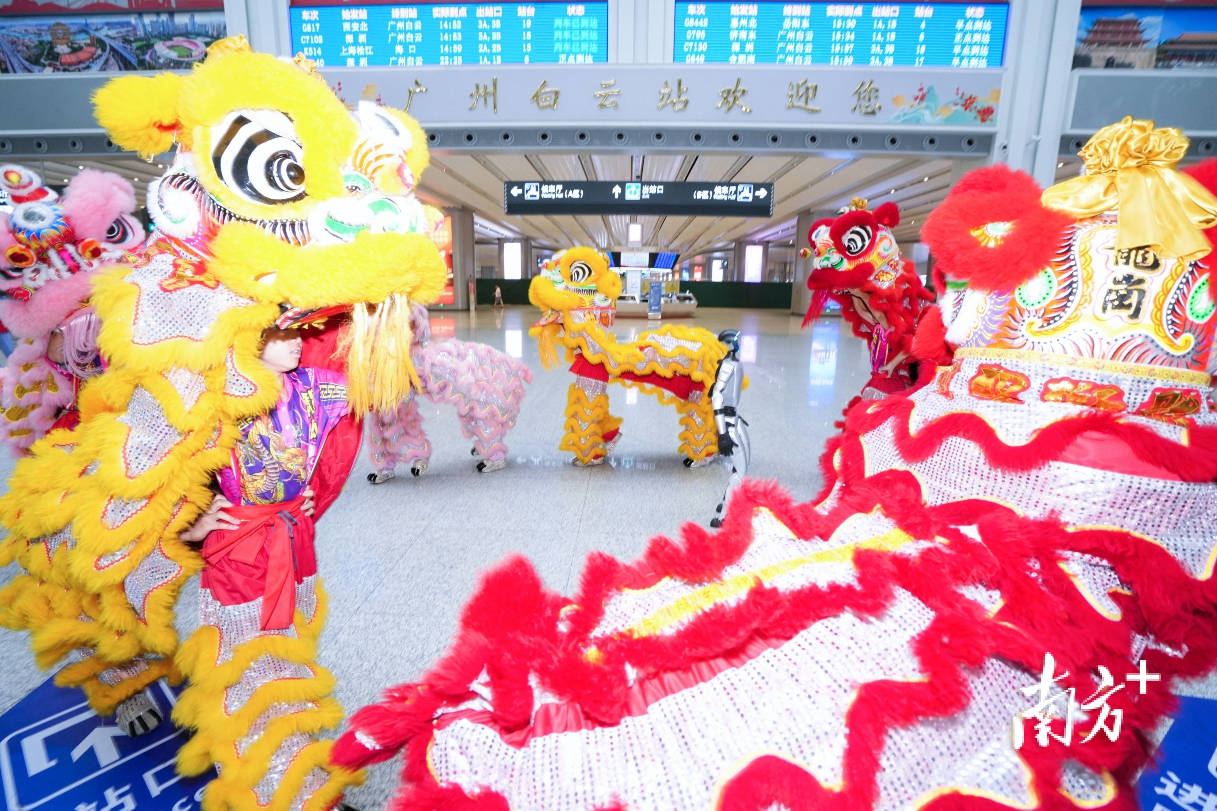 活动现场,非遗快闪表演成为全场焦点。来自龙岗的少年醒狮团队表演惊艳亮相,腾挪跳跃间尽显岭南雄风,吸引众多旅客驻足喝彩。