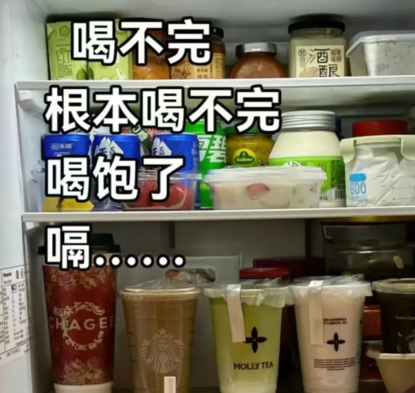 大战之下,恨不得天天喝奶茶。社交平台上,“奶茶冰箱”成为新潮流——有网友晒出塞满三开门冰箱的奶茶照片,配文“每天随机抽取一杯幸运奶茶”;更有博主发起“30天奶茶挑战”,声称要喝遍全网爆款。