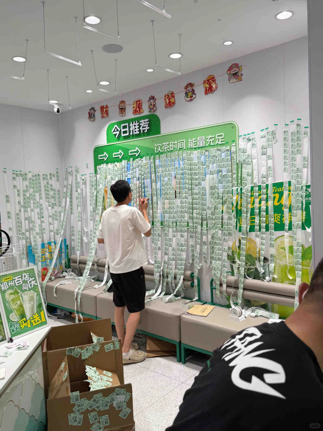 奶茶店员工也要忙疯了,订单粘满了整面墙。