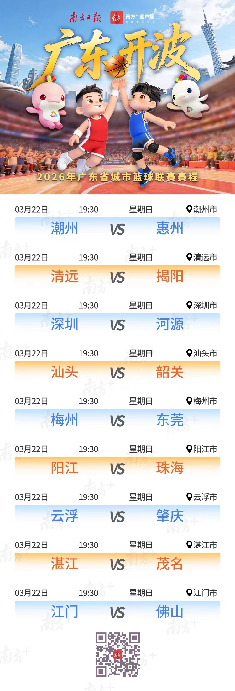 3月22日,2026年广东省城市篮球联赛(粤BA)首轮9场赛事同时开打,不仅要比各地篮球水平,各大主场更是拿出看家“好物”一争高低。关注南方+直播,可观看普通话、粤语、潮汕话、客家话多语解说,用自家方言为家乡球队撑腰。比赛直播>>