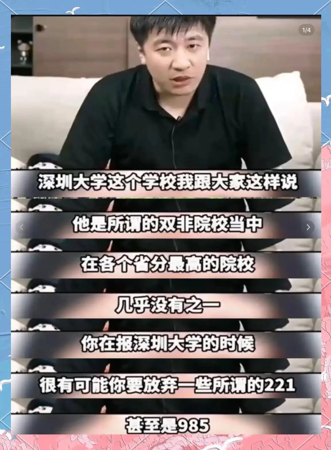 在直播中,张雪峰曾多次在直播中表达对深圳高等教育的肯定。谈到深圳大学时,他曾这样评价:“深圳大学是所谓的双非院校当中,在各个省份最高的院校,几乎没有之一。”针对部分家长对深大“非211、非985”的顾虑,他直言,深大每年毕业生进入华为、腾讯、比亚迪等知名企业的人数可观,“这个学校报了不吃亏,报了不上当。”