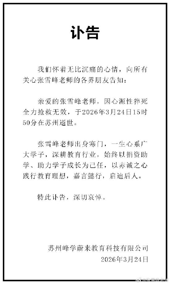 2026年3月24日15时50分,知名教育工作者、高考志愿填报专家张雪峰因心源性猝死,在苏州经全力抢救无效逝世,终年41岁。3月24日晚,其创办的苏州峰学蔚来教育科技有限公司通过官方微博发布讣告,证实了这一消息。