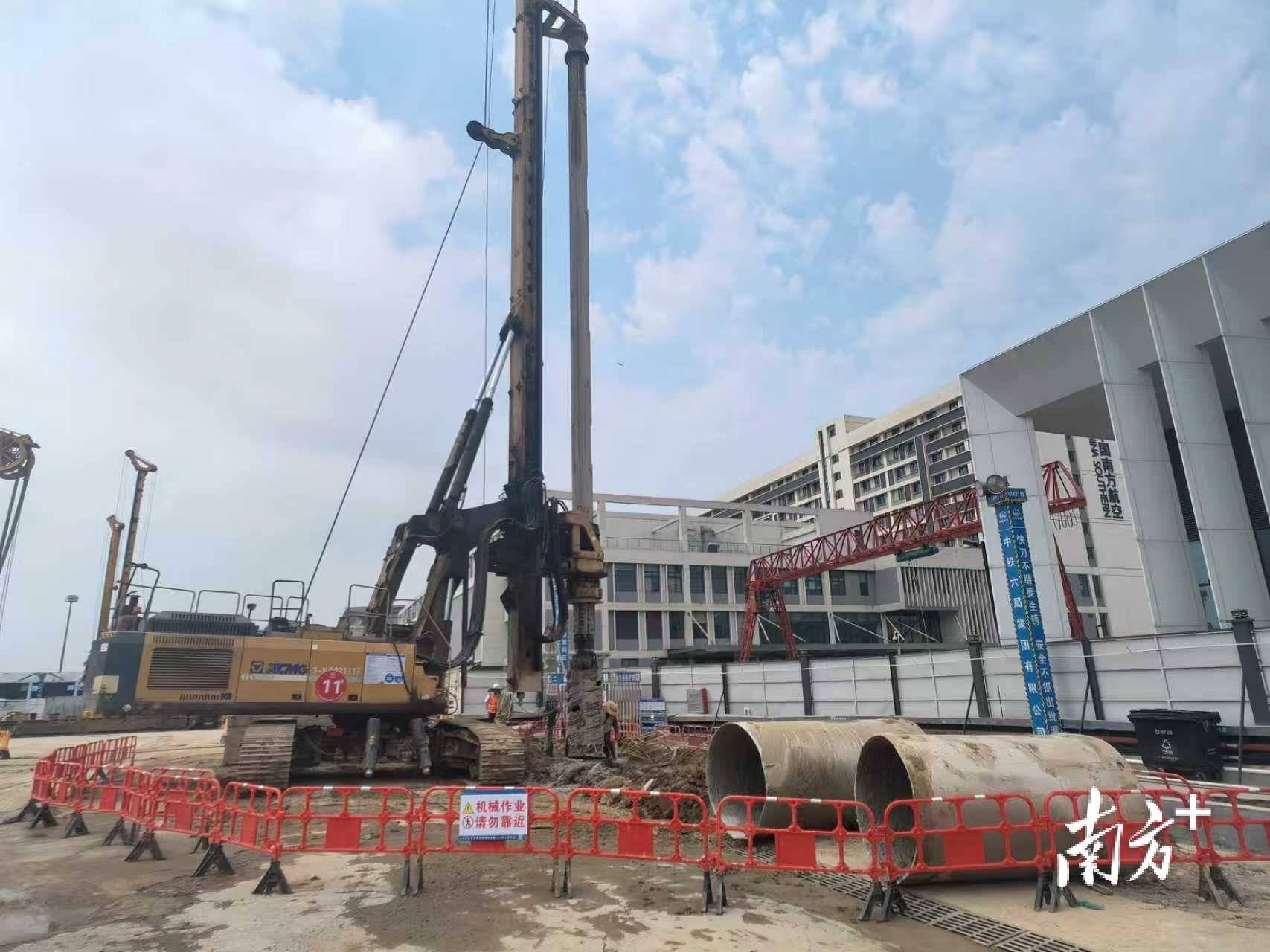 南航明珠航空城(一期)项目位于深圳市宝安国际机场航站四路29号,总建筑面积约18.57万平方米,涵盖国际货站、航材库、综合业务用房、飞行员宿舍、倒班用房、食堂、地下车库及人防工程等多个功能区。项目基坑支护工程包括咬合桩839根、立柱桩123根、高压旋喷桩36根,具有桩型种类多、桩间距小、施工组织难度大、质量管控标准高等特点。