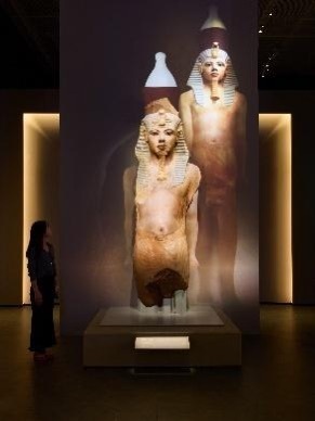 在香港故宫文化博物馆里的这一多媒体装置依据修复工作与考古记录,运用光雕投影技术虚拟复原了图坦卡门巨像的昔日面貌。图片由香港故宫文化博物馆提供