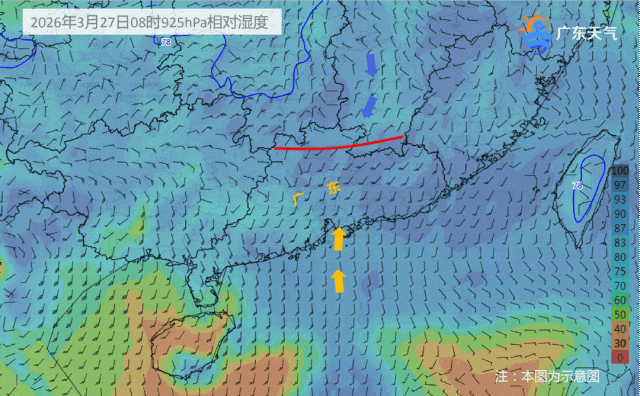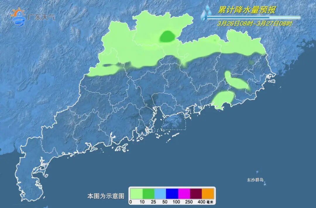 26日夜间到28日,弱冷空气影响广东,冷暖空气交汇形成切变线,27日切变线南压至广东中部,28日南风再次增强,将切变线北推至南岭附近,粤北、珠三角北部市县有中雨局部大雨或暴雨,其余市县云量增多,局部有小雨。