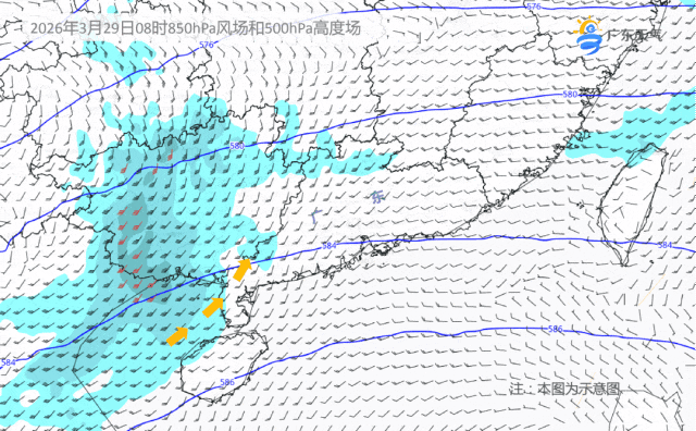 29日,低层偏南风继续增强,急流重新建立,雨势持续,同时还需警惕强对流天气,广东西北部的部分市县雷雨时伴有短时强降水、8级左右雷雨大风和冰雹等。
