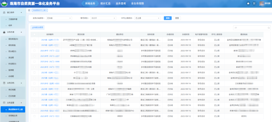 对外无缝对接省统一身份认证平台、“粤政易”、省数据资源“一网共享”平台、省用途管制监管系统、珠海市工程建设项目审批管理平台等省市重要系统;对内贯通国土空间基础信息平台、自然资源业务档案共享平台、不动产登记平台等关键业务系统,实现跨层级、跨部门高效协同。平台上线以来,向省“一网共享”平台推送数据2452条,向省用途管制系统推送数据1870条,向珠海工建审批平台推送数据4714条,向国土空间基础信息平台推送数据3225条,向不动产登记平台推送数据2996条。