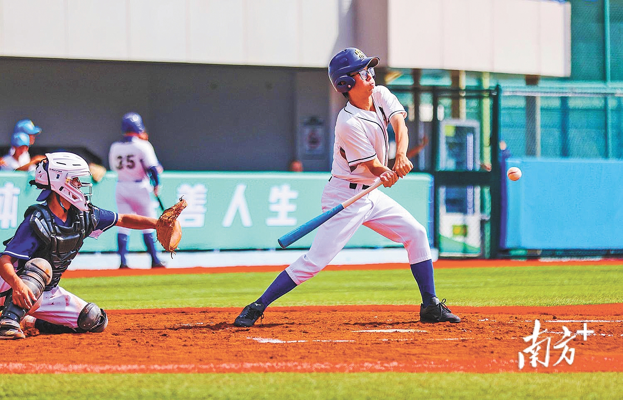在中山国际棒垒球中心举行的2025广东省青少年棒球锦标赛上,中山队球员在击球。 叶志文 摄