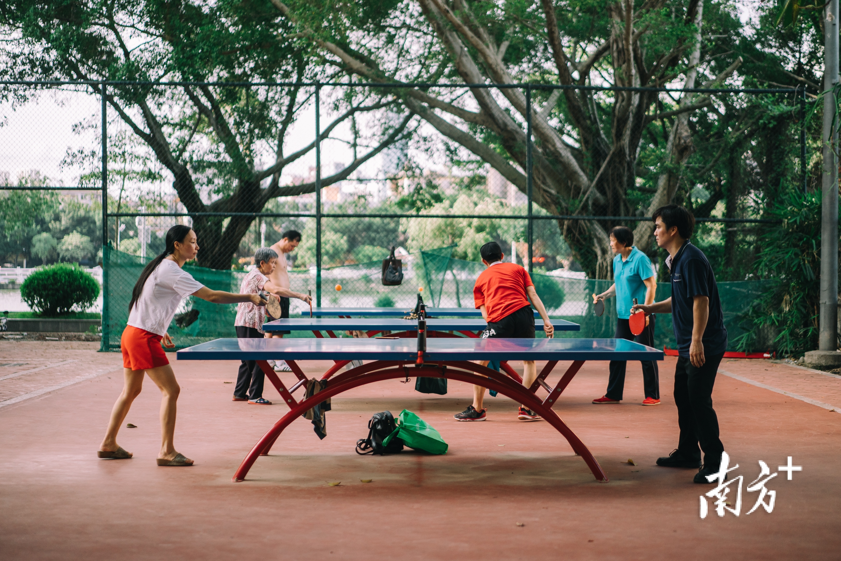 滨江公园里市民在打乒乓球。