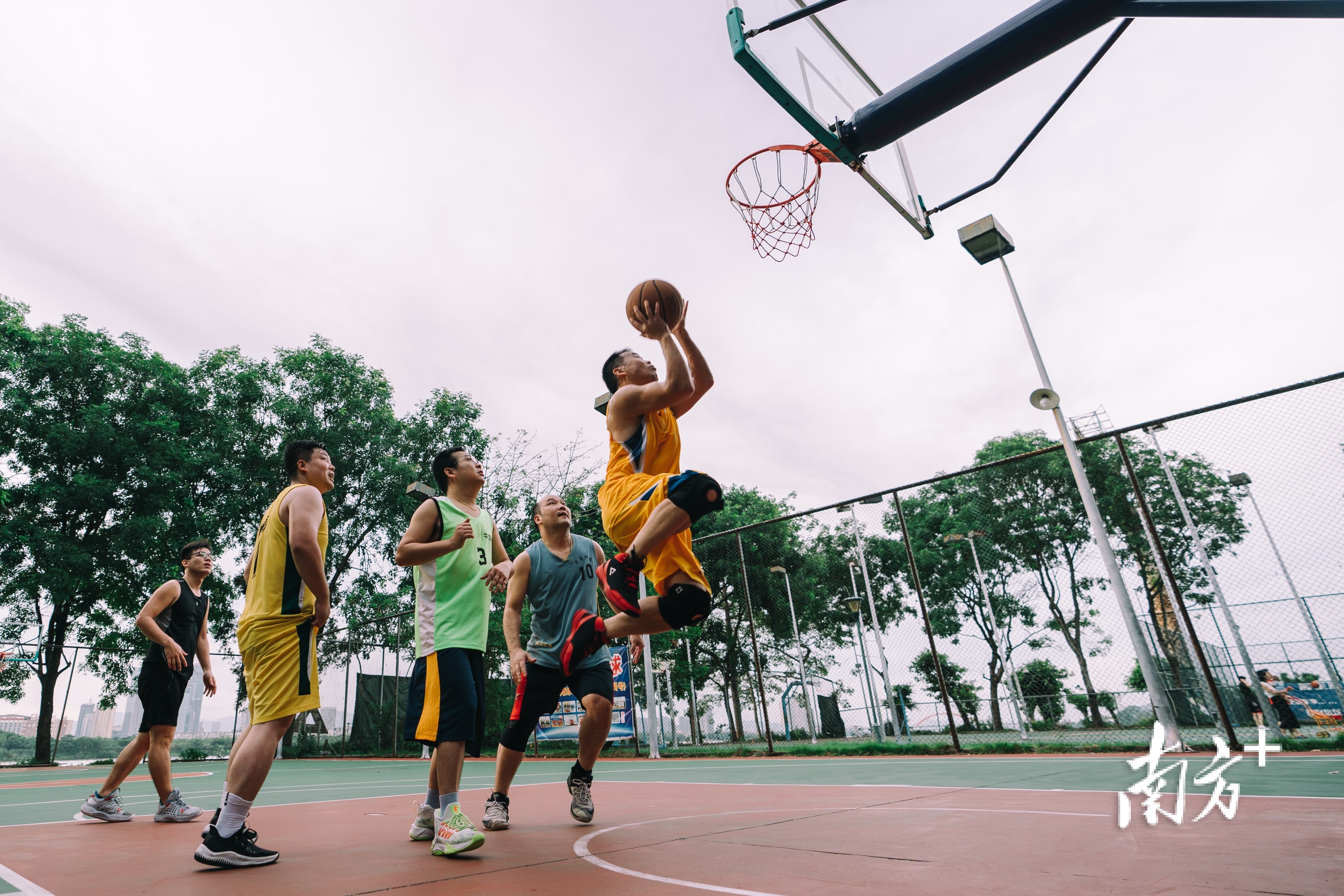 东江沙公园里市民在打篮球。