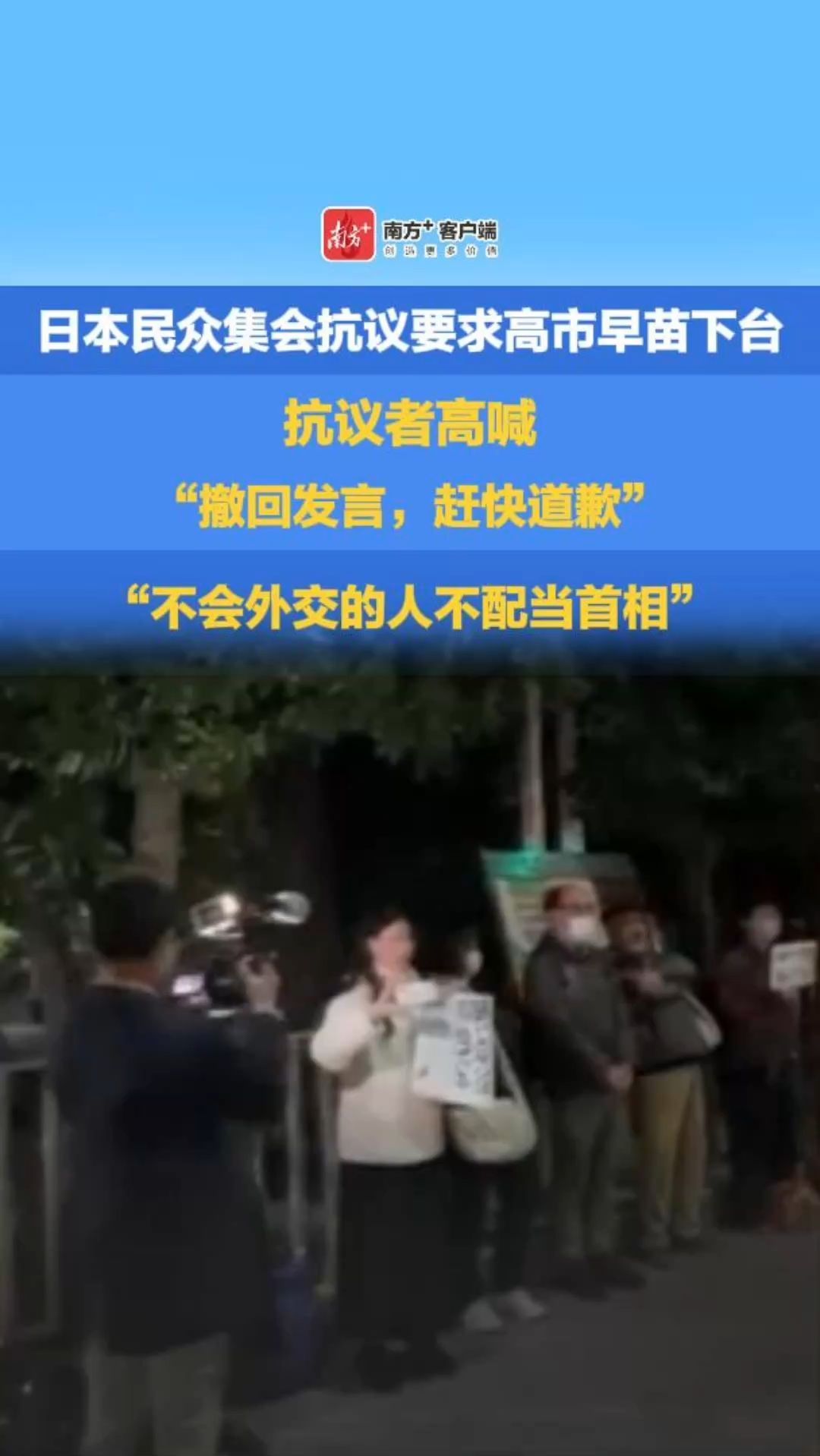 抗议者在现场高喊“撤回发言,赶快道歉”“高市下台”“不会外交的人不配当首相”等口号,要求高市早苗辞职下台。