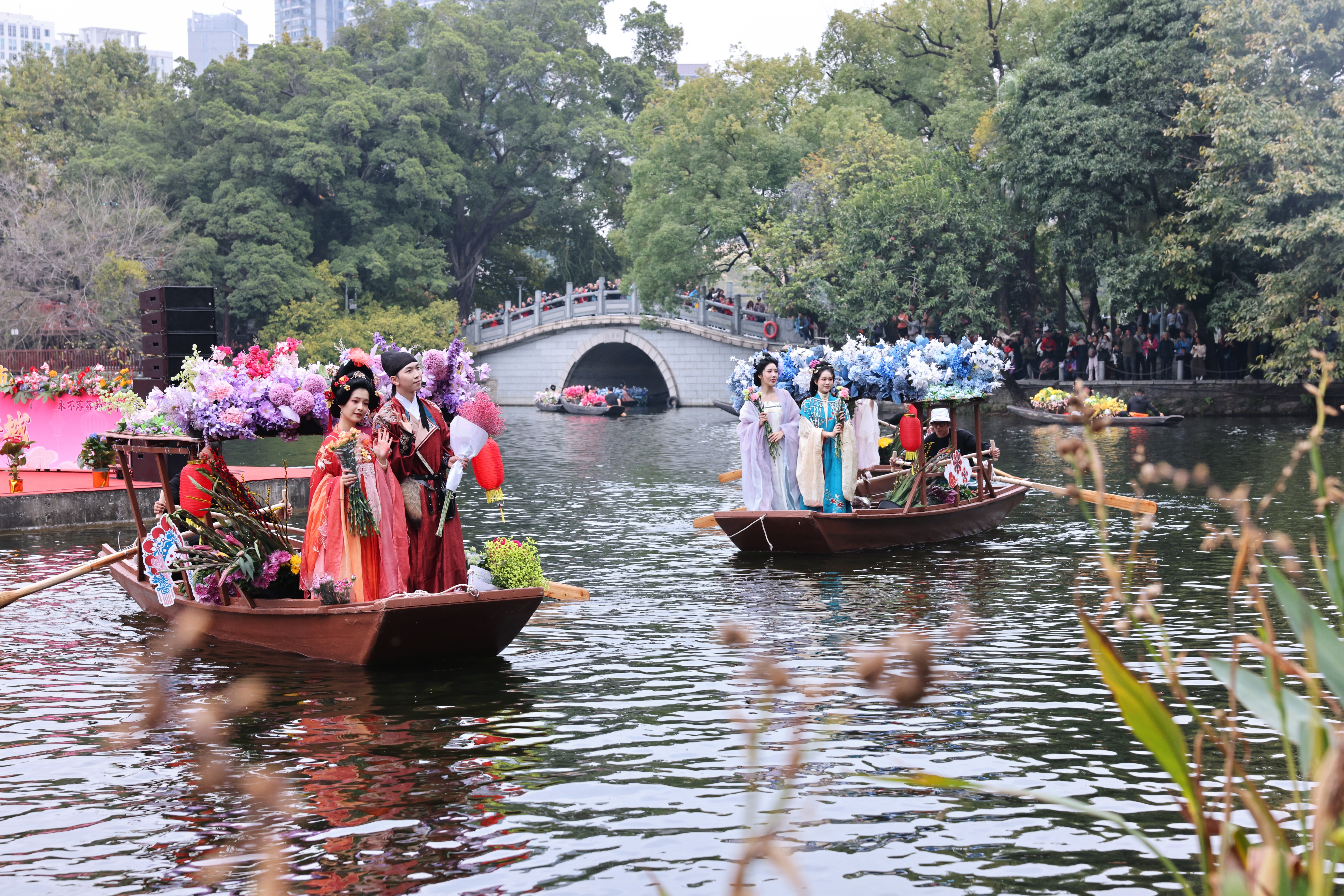 春节期间,水上花市开埠,满载年桔、桃花的疍家小船在碧波上穿梭,处处洋溢着地道广州年味。