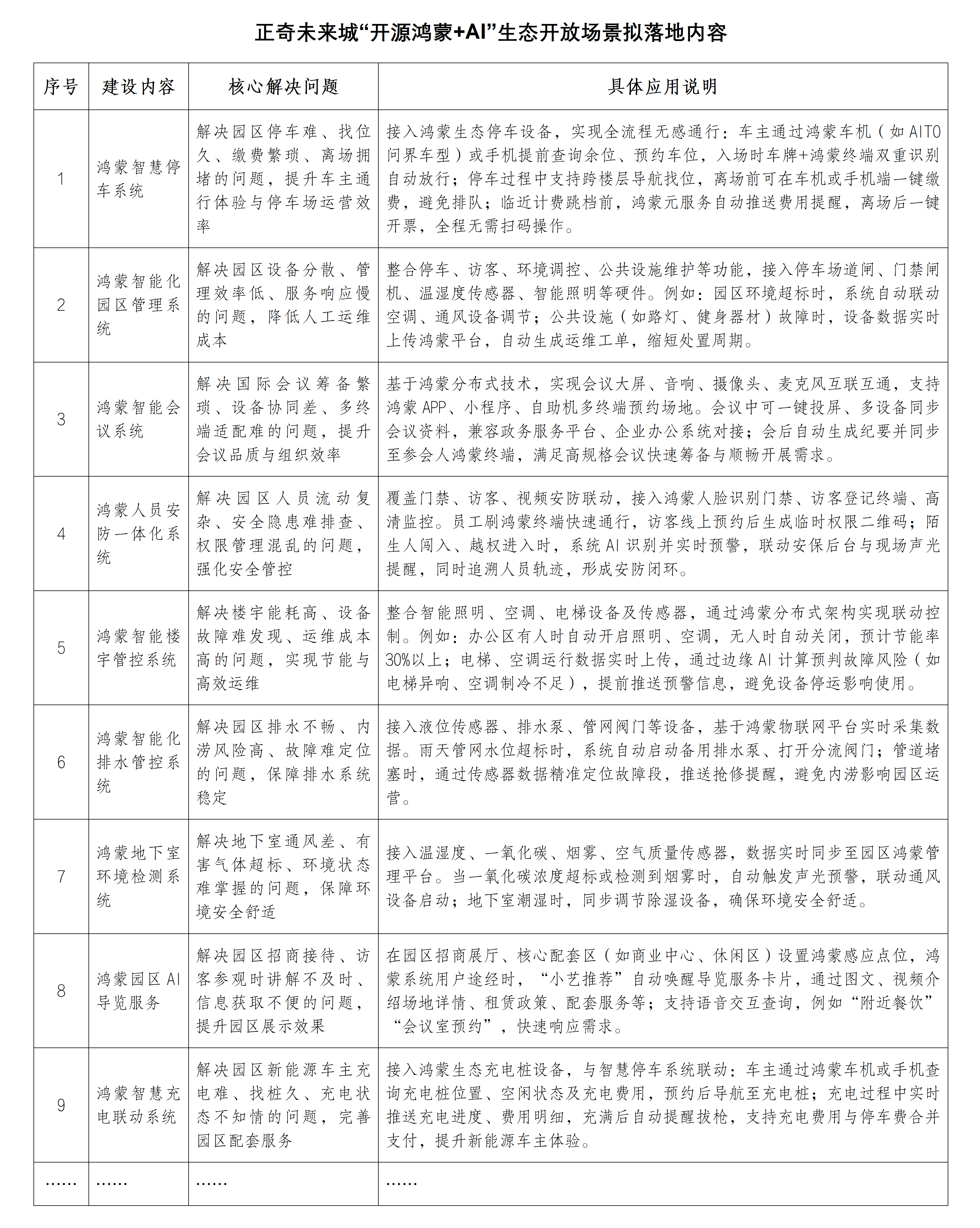 通过鸿蒙智慧停车系统,实现车位查询、无感通行与一键缴费,极大优化停车体验;鸿蒙智能会议系统支持多设备协同与跨端预约,会后纪要自动推送,提升会议效率;鸿蒙人员安防一体化系统结合人脸识别与AI预警,实现访客管理与异常行为实时监控,保障园区安全;鸿蒙智能楼宇管控系统自动调节照明空调,节能超过30%,并具备设备故障预判能力;鸿蒙智能化排水管控系统实时监测水位,自动响应内涝风险;鸿蒙地下室环境检测系统实时监测空气质量,联动通风除湿,确保环境安全舒适;鸿蒙园区AI导览服务在关键区域自动推送招商与配套信息,支持语音交互;鸿蒙智慧充电联动系统与停车联动,实现找桩、充电、支付一站式服务;最终打造鸿蒙智能化园区管理系统,整合停车、访客、能耗、设备等数据,实现统一调度、故障自动报修与智能工单管理。