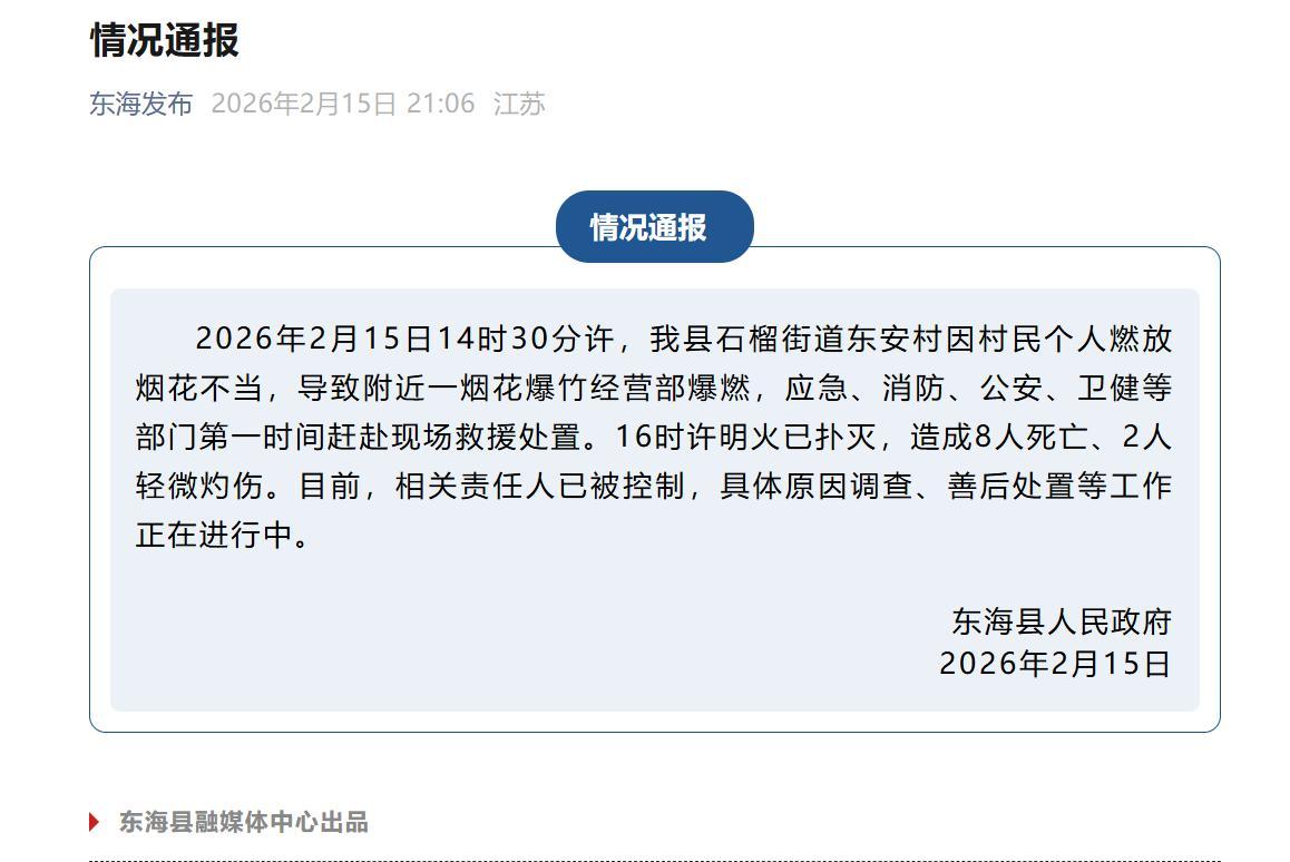 据央视报道,2026年2月15日14时30分许,江苏省连云港市东海县石榴街道东安村因村民个人燃放烟花不当,导致附近一烟花爆竹经营部爆燃,应急、消防、公安、卫健等部门赶赴现场救援处置。16时许明火已扑灭,造成8人死亡、2人轻微灼伤。