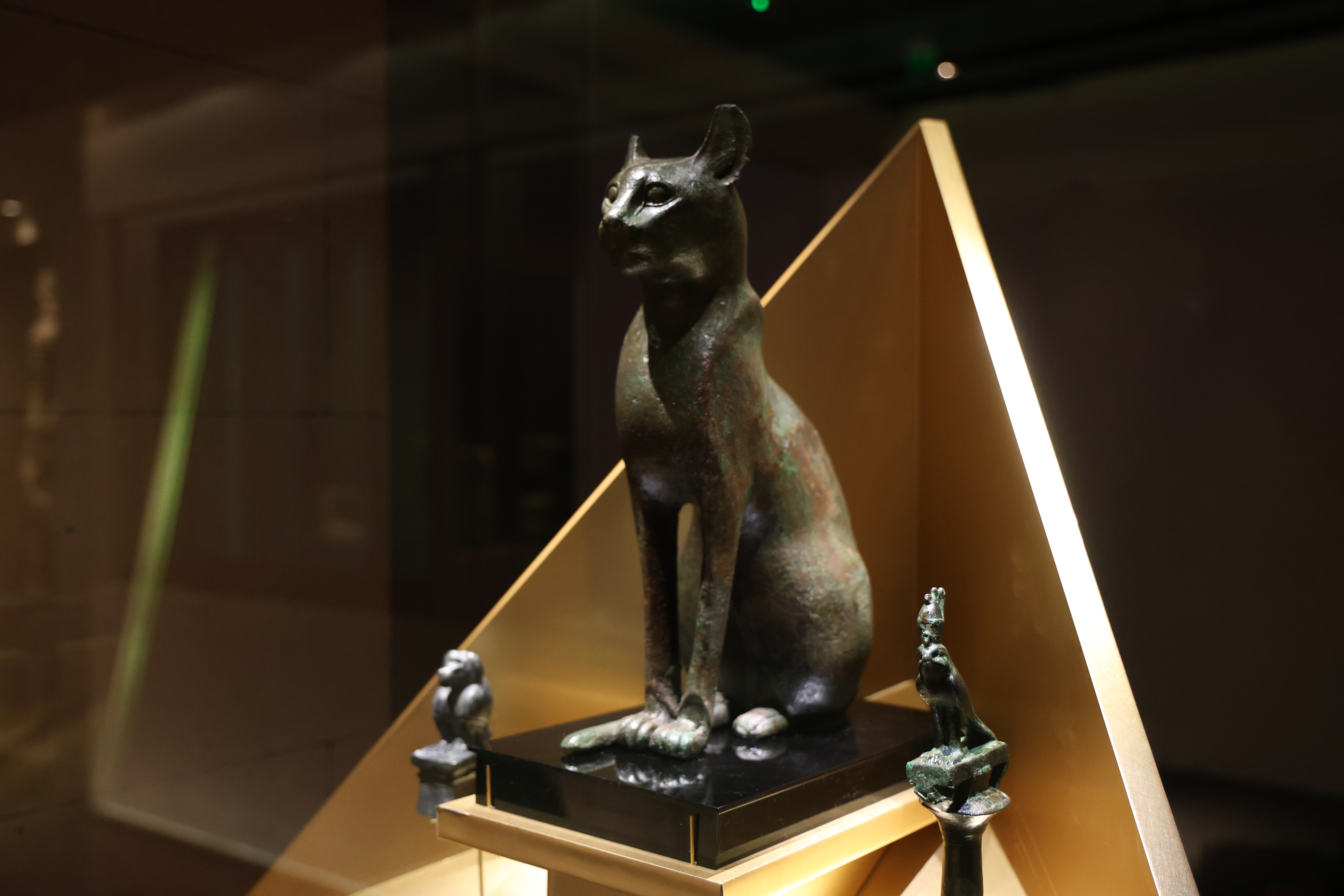 当古埃及的“法老”带着木乃伊与猫跨越万里来到广州,观众将发现不同文明在面对生存、权力与死亡等共同命题时,有着跨越山海的惊人契合。古埃及人通过精妙的木乃伊与彩绘内棺守望来世,南越先民则以万片玉石缝缀成丝缕玉衣渴求不朽,两者虽材质各异,却共同书写了人类对生命无限延续的浪漫想象;侧面姿态威严的埃及皇家狮身人面像,与南越文化中刚猛的错金铭文铜虎节,分别以狮虎之威固化权力秩序,折射出早期文明对自然力量的共通崇拜。
