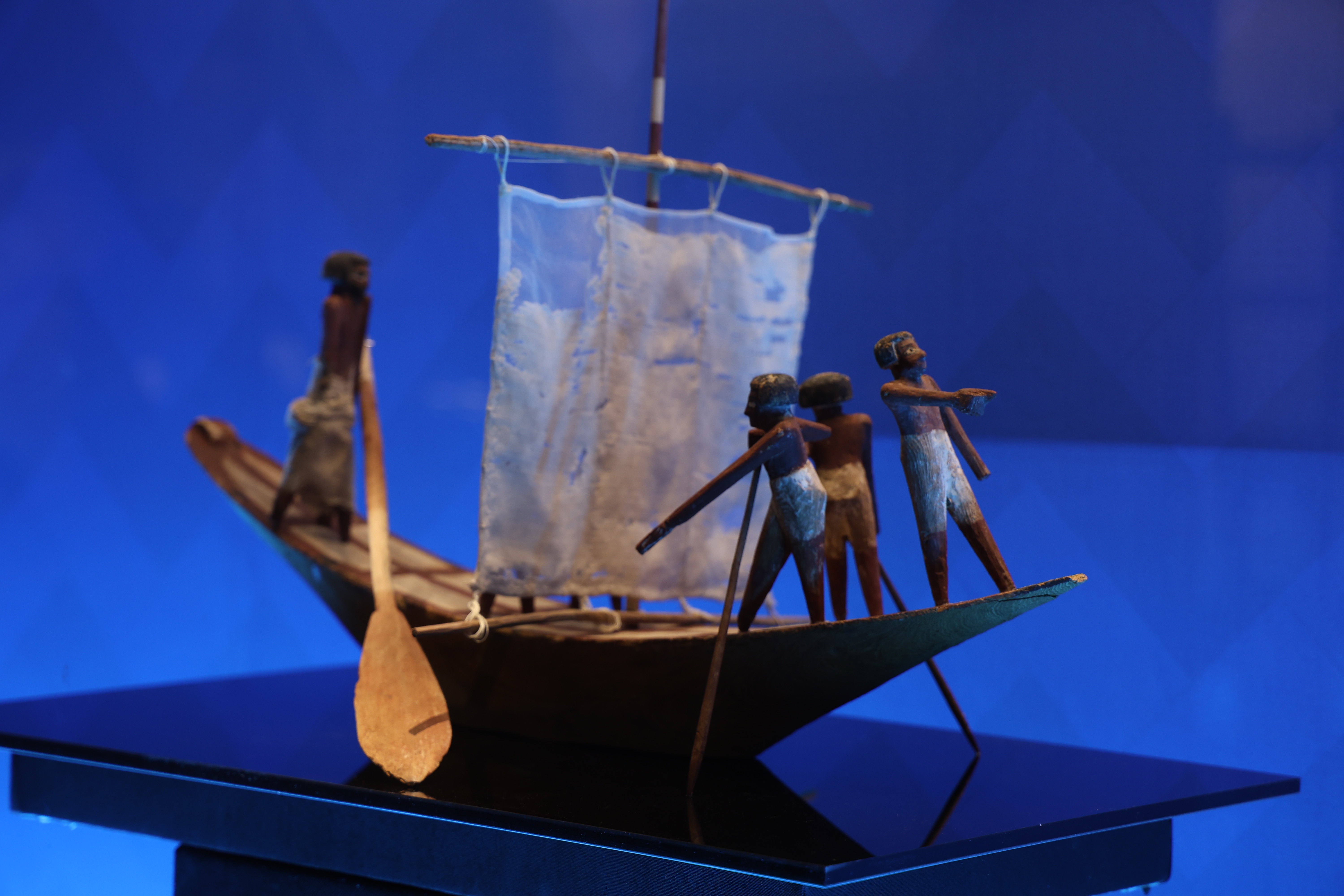 此外,埃及神话中作为灵魂化身的“巴鸟”与南越王墓出土漆木屏风上翩然起舞的朱雀,均以飞鸟羽翼寓意灵魂的升华;而见证尼罗河航运繁荣的古埃及帆船模型,与描绘岭南先民向海而生的羽人船纹,共同勾勒出河海文明以舟楫联结世界的梦想。这些分散在馆内的文明碎片,共同拼贴出人类早期文明在不同地理条件下,所产生的关于宇宙观、权力观与生死观的镜像折射。
