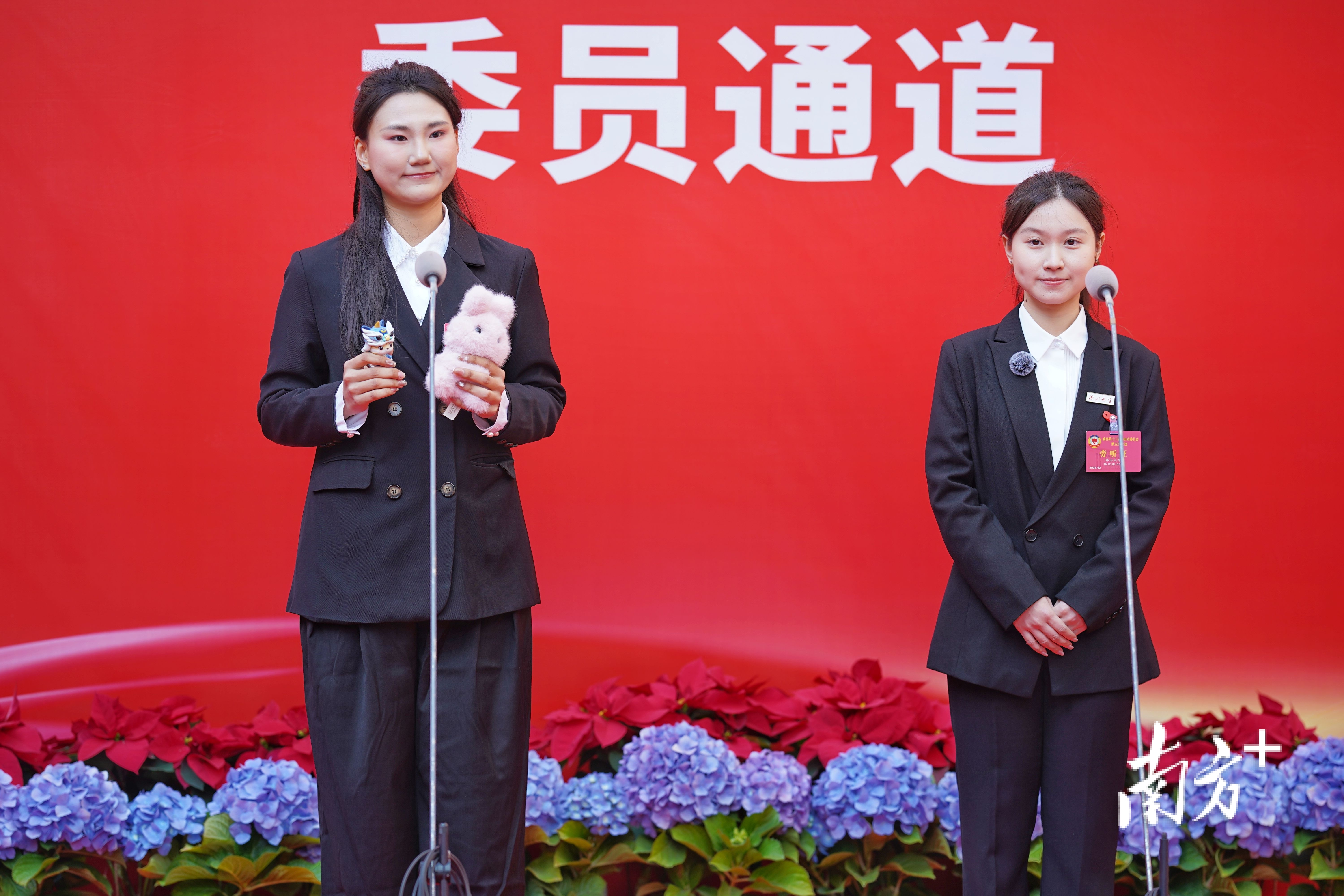 佛山大学学生杨芷诺和佛山职业技术学院学生李紫佳带着“模拟提案”亮相委员通道。 南方+ 戴嘉信 拍摄