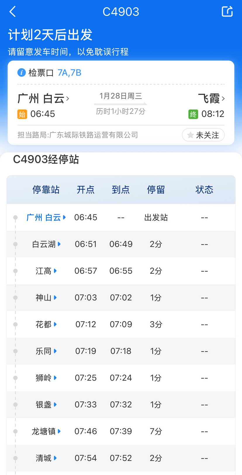 12306系统显示,广州白云站出发,往清远的北向列车终点有清城站、飞霞站等长短线,以及多种快慢线。其中,广州白云站到清城站的特快列车,中途只停花都站,实现15分钟到达花都站,33分钟到达清城站;广州白云站到飞霞站的站站停列车,24分钟到花都站,67分钟到清城站,87分钟到终点站。